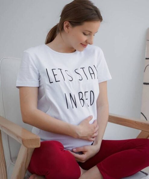Футболка свободного кроя из хлопкового трикотажа с секретами для кормления малыша без молний. Крой позволяет носить футболку на любом сроке беременности и после. Она идеальна в качестве одежды для дома. Принт на футболке: Lets stay in bed.