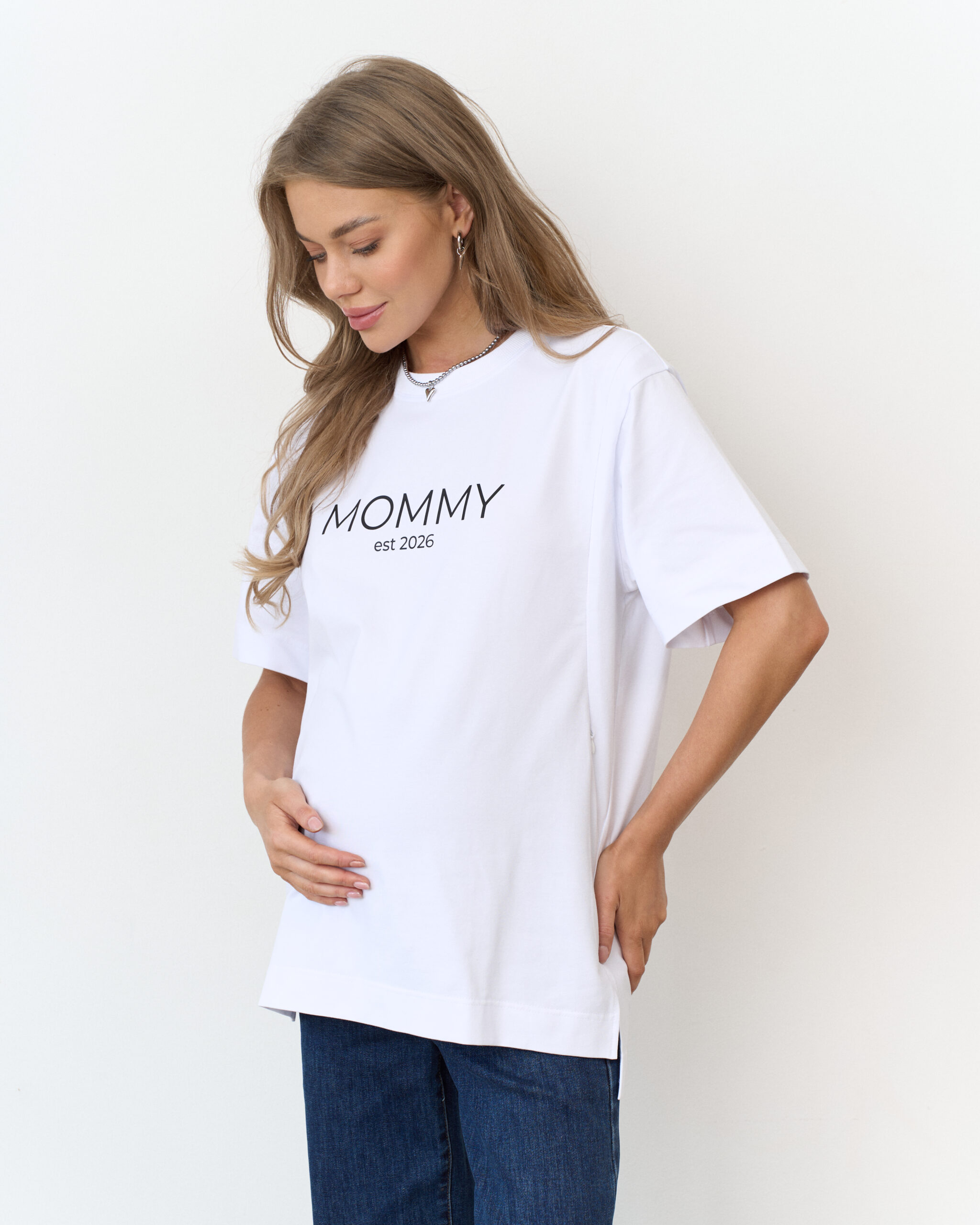 Футболка актуального кроя оверсайз из хлопкового трикотажа с принтом MOMMY est 2026. Подойдет для любого срока беременности и после. Для кормления малыша выполнены удобные вертикальные молнии.