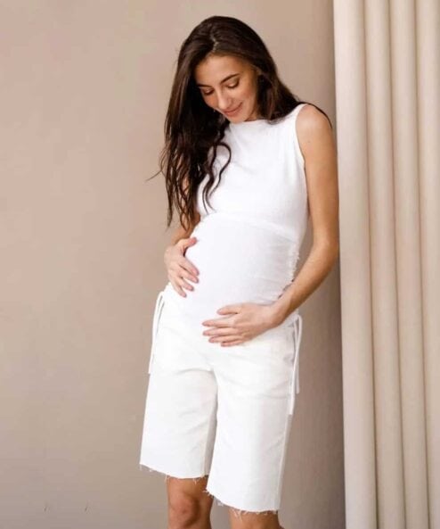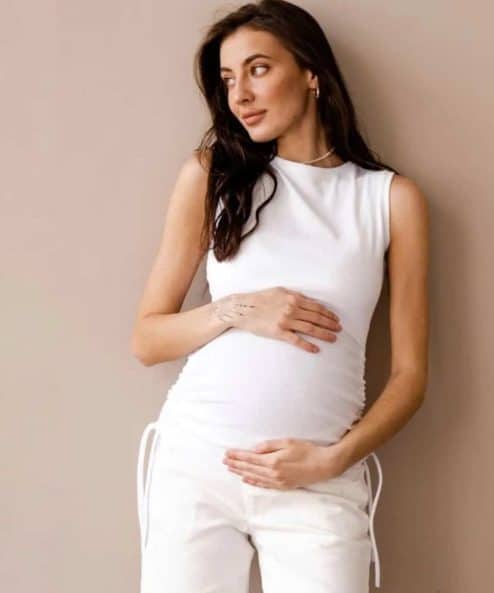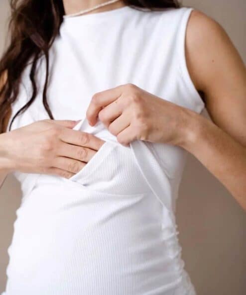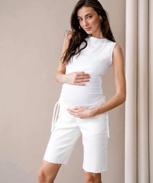 Майка для беременных и кормящих мамочек. Изделие выполнено из мягкого трикотажа в рубчик, по бокам расположены кулиски, на груди полочка, которая выгодно маскирует секрет для кормления малыша.