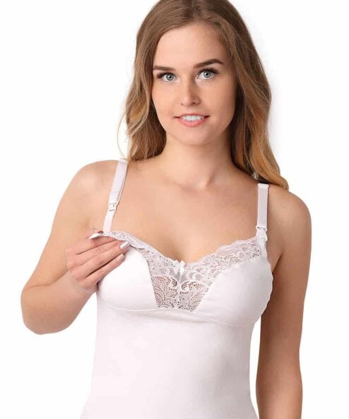 Нежная базовая майка с кружевом. Сделана из хлопка высшего качества «Пенье». Секрет для ГВ — отстегивающаяся бретелька.