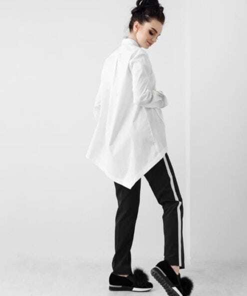 Удлиненная рубашка необычного ассиметричного кроя. Подойдет для любого срока беременности и после. Для кормления грудью расстегните пуговицы на центральной планке.