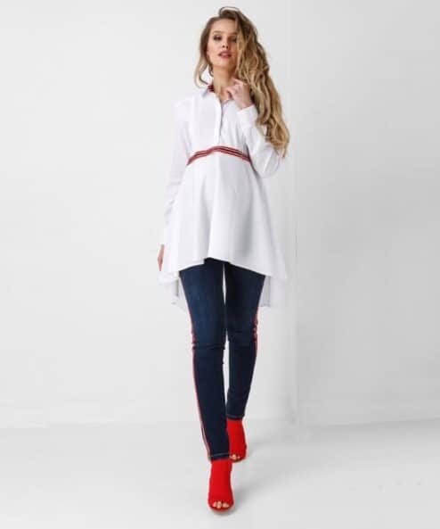 Стильная удлиненная рубашка с лампасами для беременных и кормящих мам. Такую рубашку можно носить как с классическими брюками, так и с джинсами в стиле casual. Для кормления малыша сделаны незаметные молнии в рельефах.