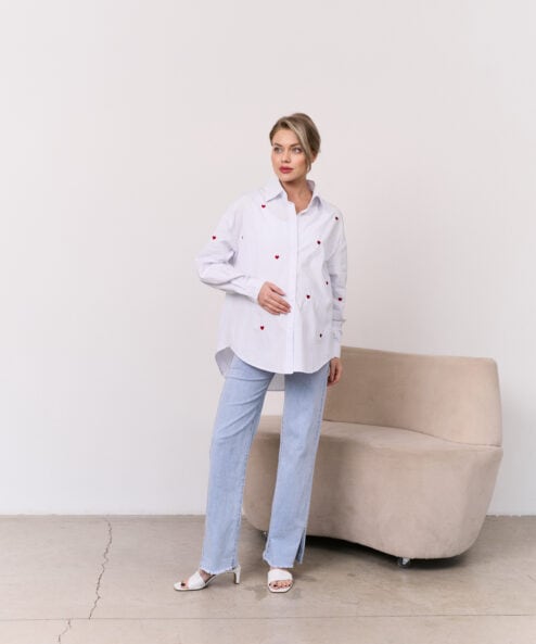 Стильная рубашка для беременных и кормящих мам с принтом в сердечко. Такая рубашка станет отличным дополнением джинсам, шортам или юбкам и придаст настроения вашему летнему образу. Для кормления пуговицы расстегиваются.