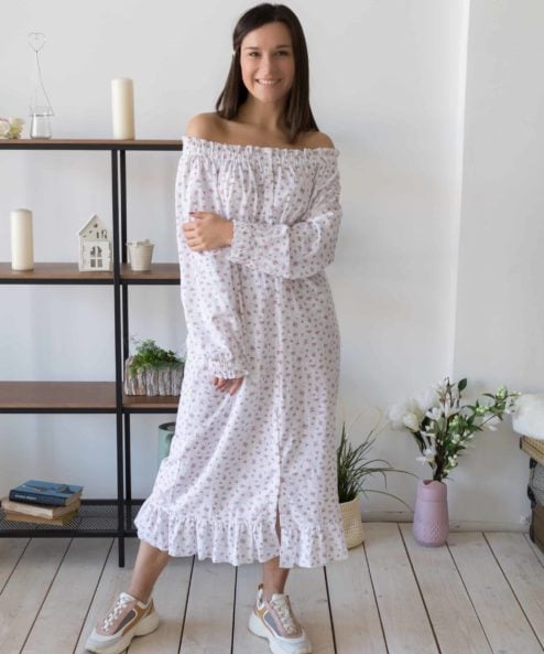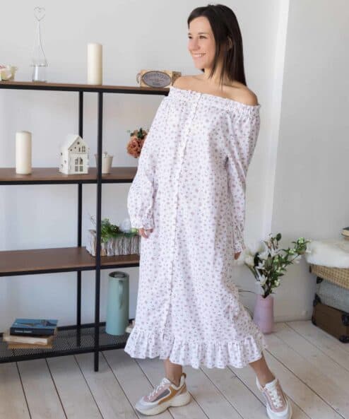Льняное платье романтичного стиля с открытыми плечами длины миди. Для грудного вскармливания малыша расстегиваются пуговицы на передней планке платья.
