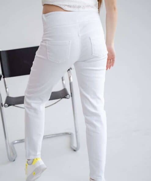 Актуальные джинсы-moms для будущих мам зауженного кроя. Пояс выполнен в виде высокой трикотажной вставки.