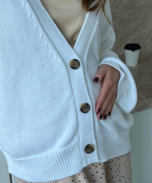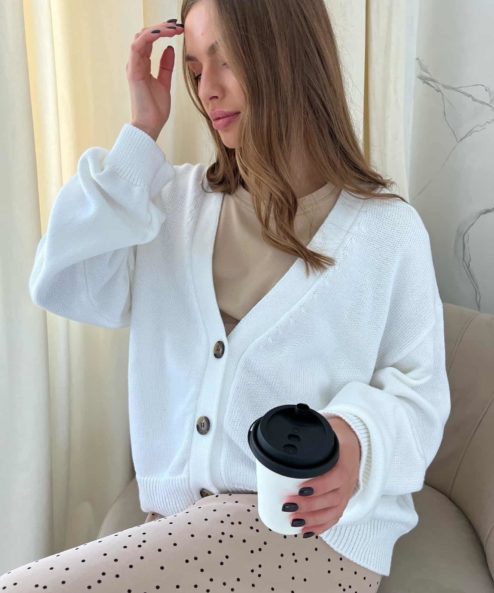 Белый кардиган в стиле «оверсайз» свободного кроя. Легкий, нежный, мягкий и приятный на ощупь. На его основе можно создавать стильные образы под любую ситуацию – от делового и строгого до нежного и романтичного. Белый цвет — благородный и элегантный. Кардиган в этом цвете добавит утонченности и изысканности Вашему образу.