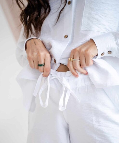 Костюм для беременных и кормящих мам из легкой хлопковой ткани состоит из мягких лаконичных шорт с удобной кулиской под животик и свободной рубашки с традиционным воротничком, застежкой спереди на маленькие пуговички и нагрудным карманом.