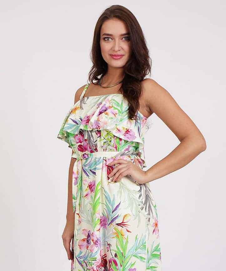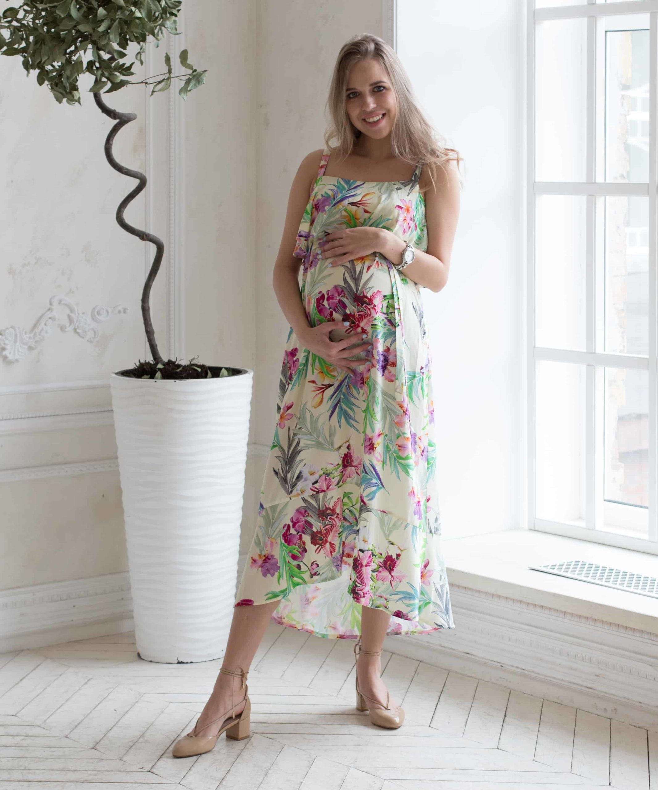 Очень красивый сарафан для беременных и кормящих из штапеля с принтом на все случаи жизни. Свободный, летящий фасон украшен воланами по груди и низу, и при желании можно подчеркнуть грудь или талию тонким пояском. Легкий перепад длины добавляет изящности силуэту. Комбинируя сарафан с различными аксессуарами и обувью каждый раз можно получать новый образ. Незаметные секреты для кормления (потайные молнии в нагрудных рельефах) еще добавляют универсальности и практичности.