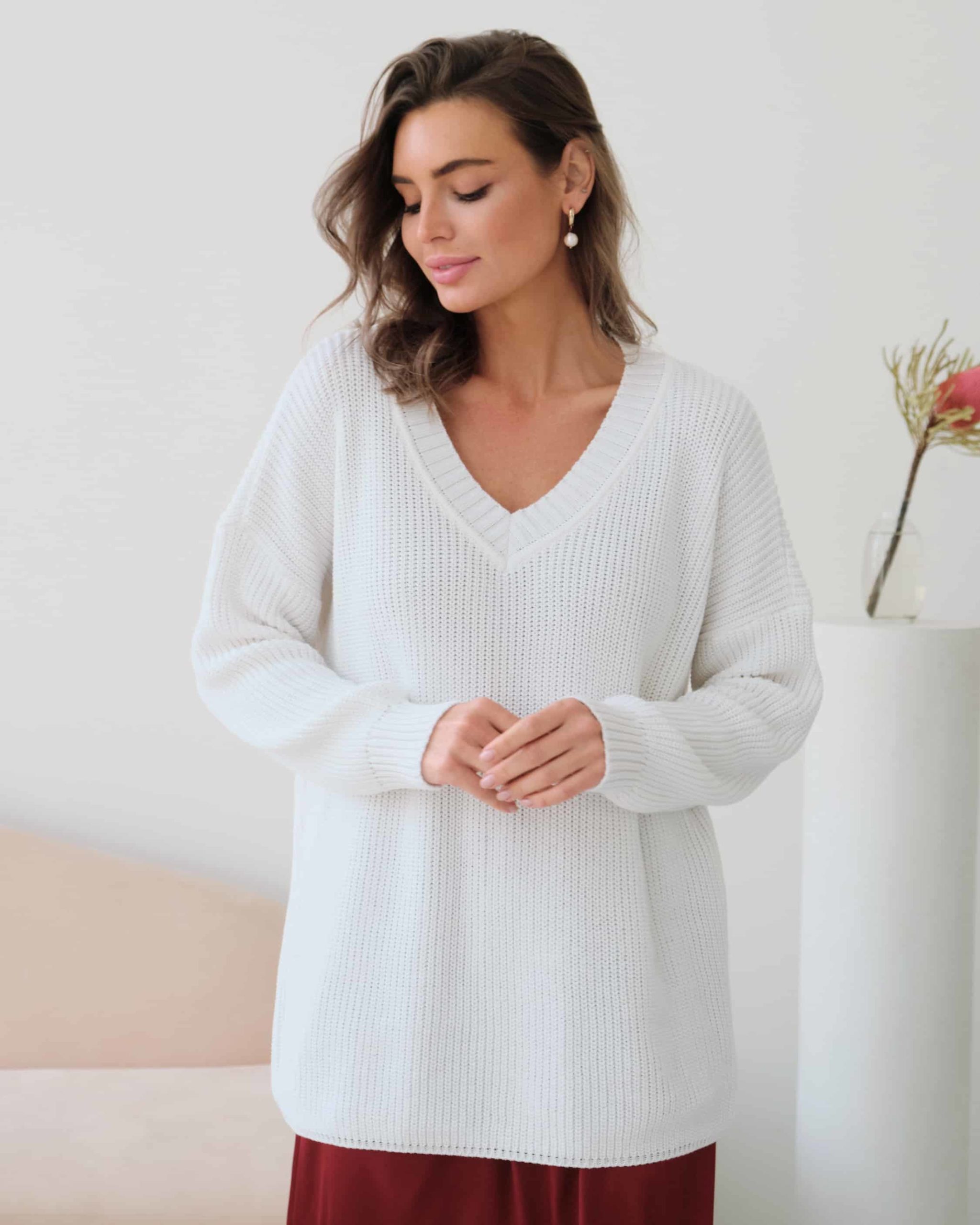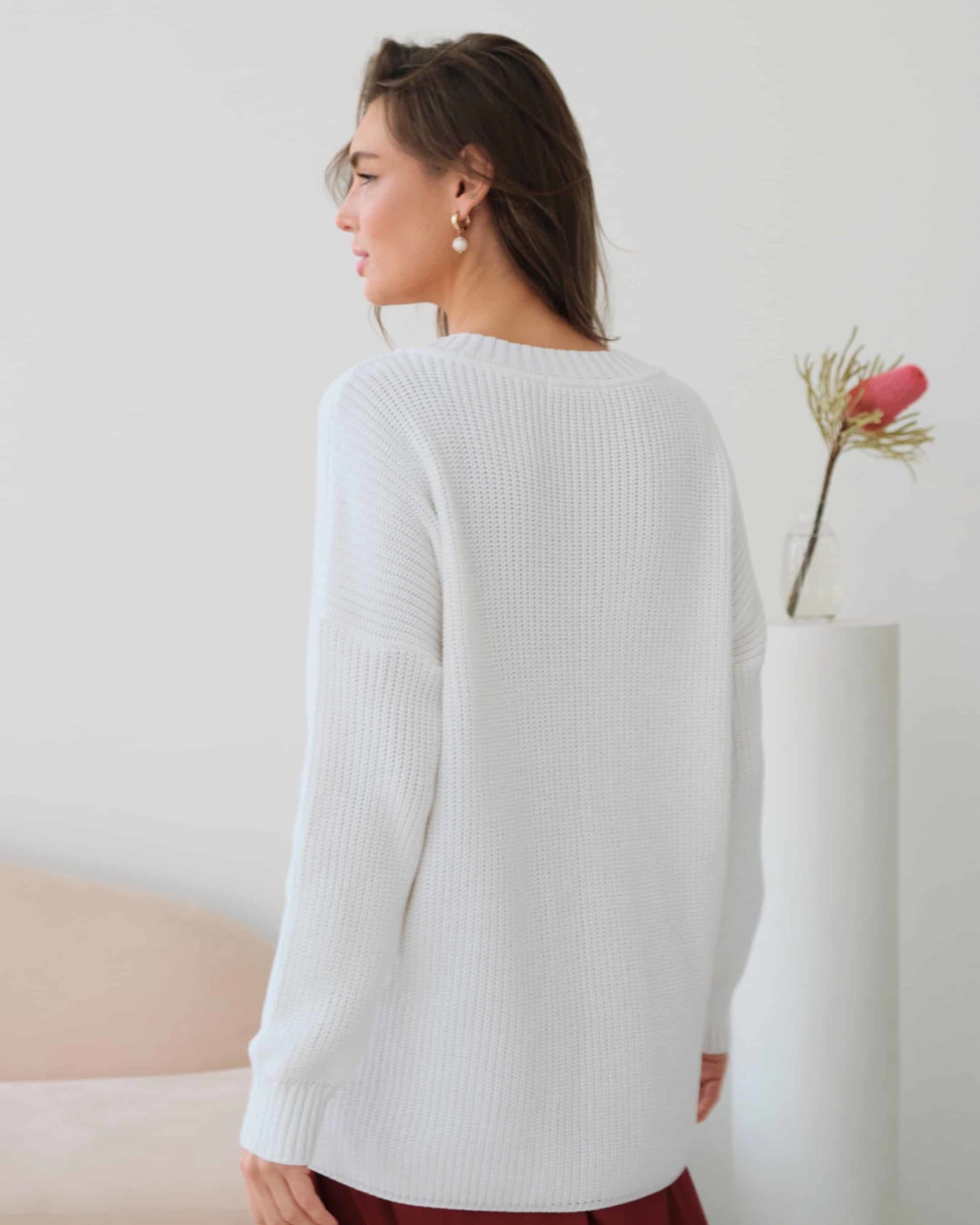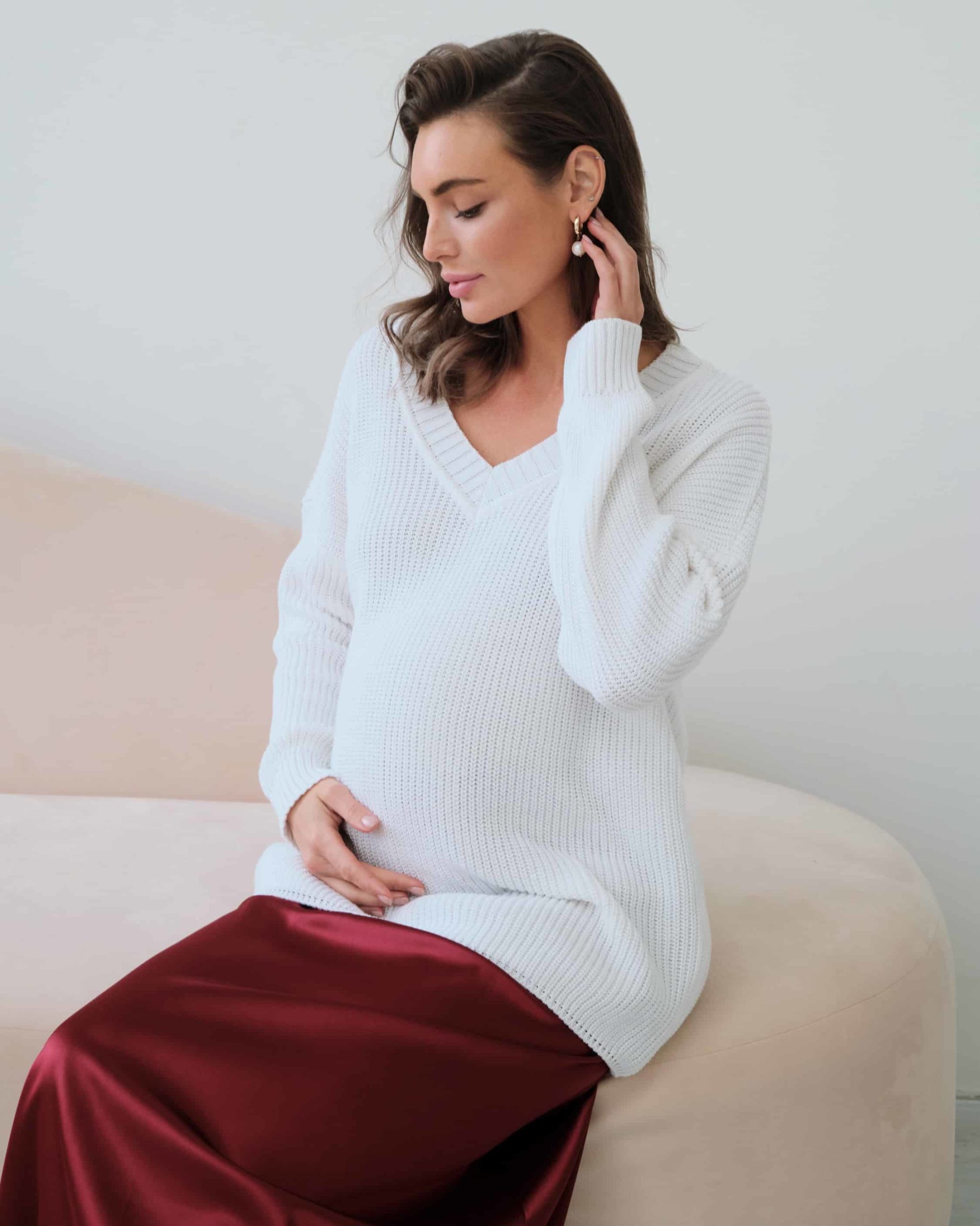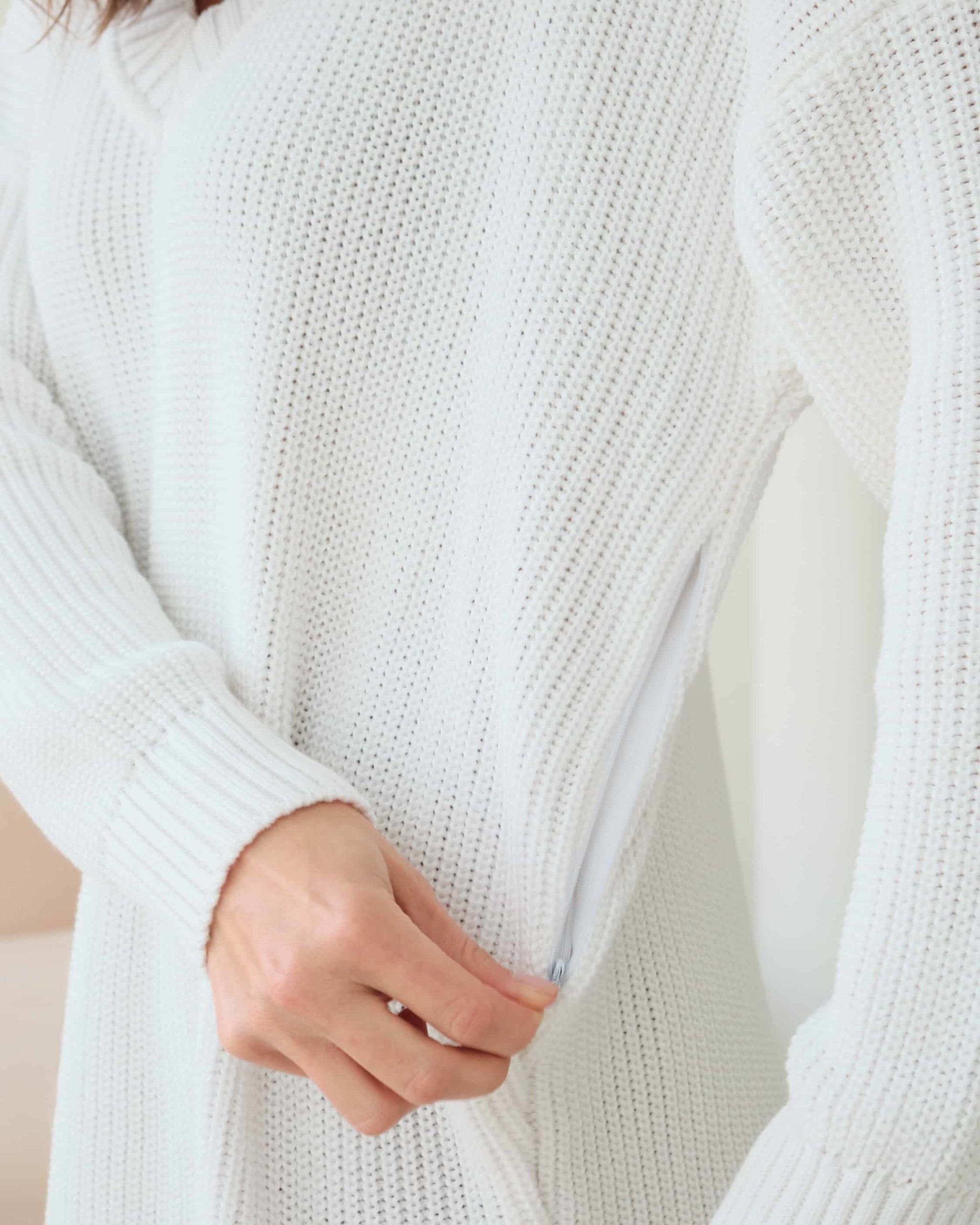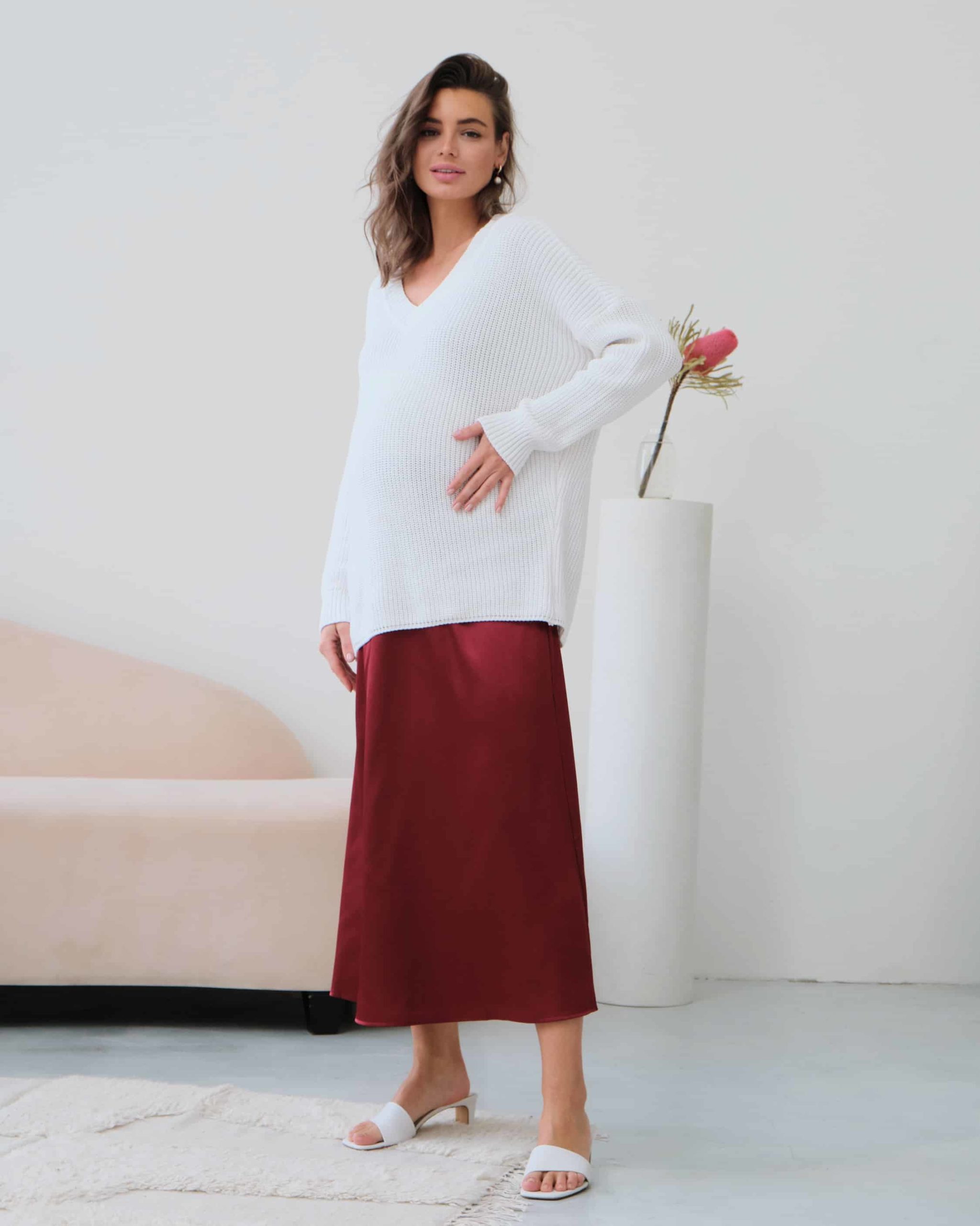 Хлопковый свитер с V-вырезом и спущенной линией плеч, который подойдет на любой срок беременности и после. Мягкая эластичная вязка и натуральный состав пряжи подарят комфорт в любое время года. А приятные базовые цвета и актуальный крой позволят создать стильные образы. Для кормления малыша предназначены потайные молнии в боковых швах.