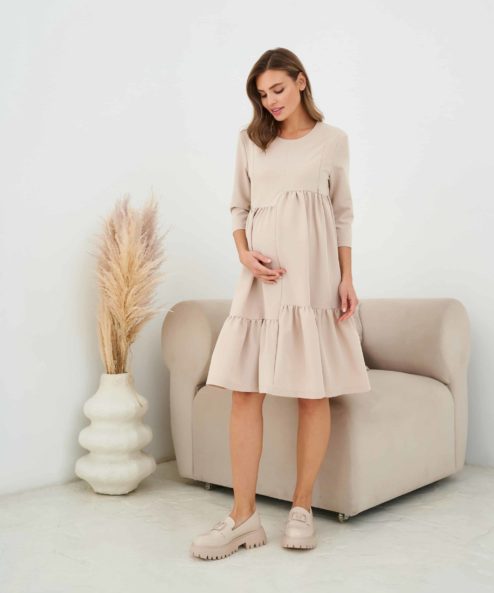 Стильное и необычное ярусное платье из костюмной ткани. Подходит на любой срок беременности и после. Секрет для кормления — незаметные молнии.