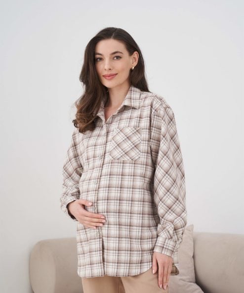 Стильная удлиненная рубашка в клетку, которая подойдет на весь срок беременности и после. Такую рубашку можно сочетать с брюками, шортами, джинсами и даже платьями. А натуральный состав ткани подарит комфорт в любой ситуации.