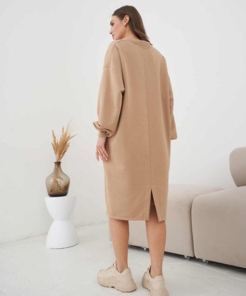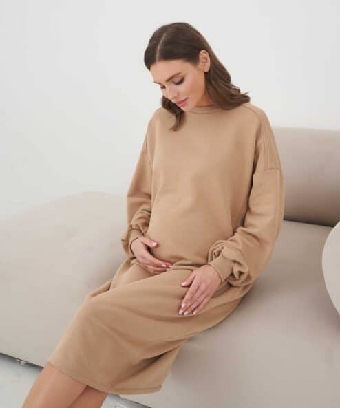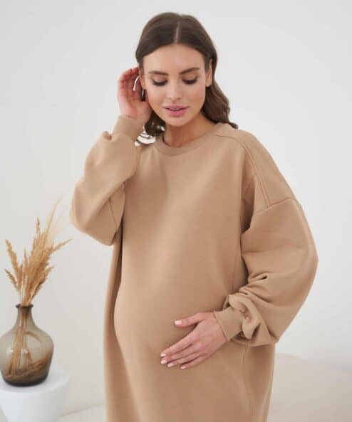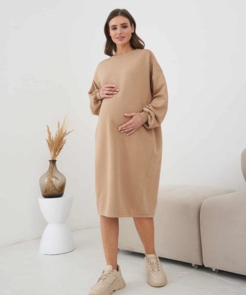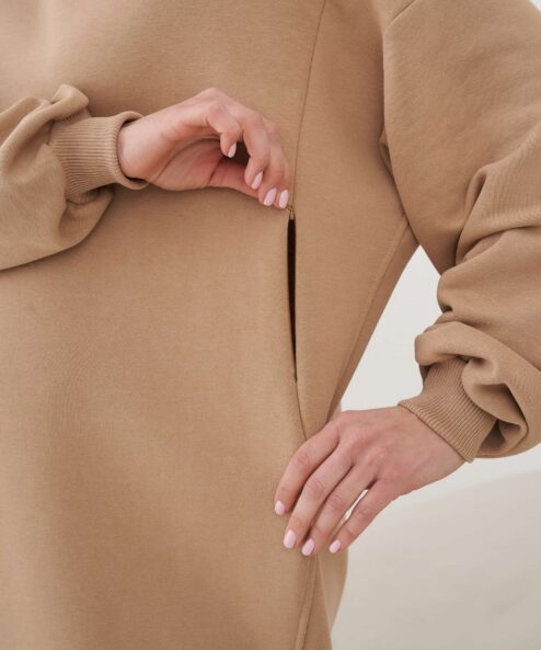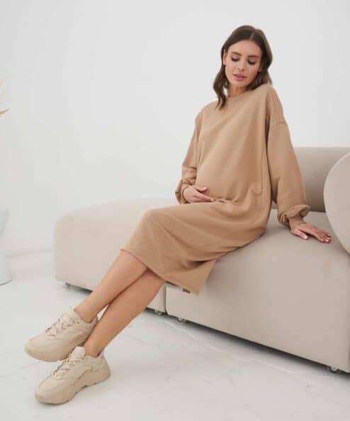 Платье-свитшот кроя оверсайз для будущих и кормящих мам из  из хлопкового футера-трехнитки высшего качества «пенье». Платье выполнено в комфортной длине миди и скроено специально для растущего животика. Для грудного кормления — секреты в рельефах на груди в виде потайных молний.