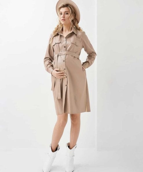 Бежевое платье-рубашка из эко-кожи для будущих и кормящих мам Melinda