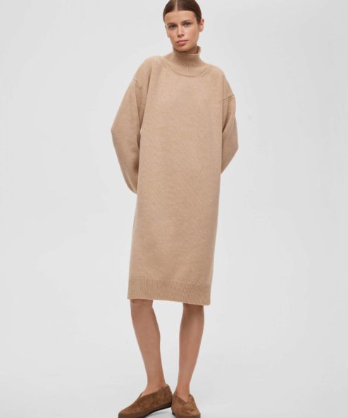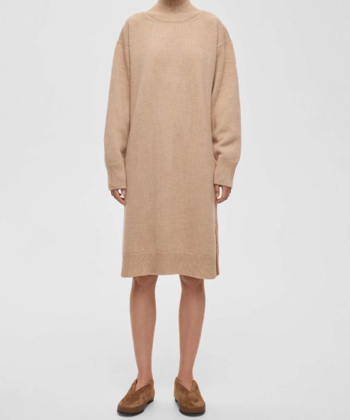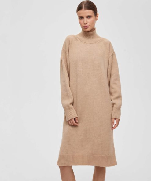 Комфортное шерстяное платье свободного кроя длины миди, с воротником-стойкой, разрезами по бокам и спущенным плечом. Подойдет на любой срок беременности и после.