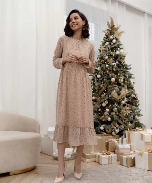 Бежевое платье в горошек для будущих и кормящих мам Valencia