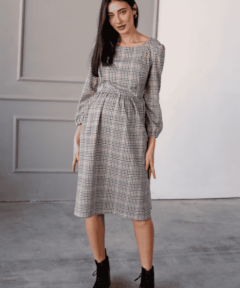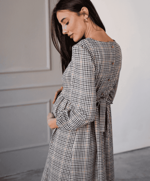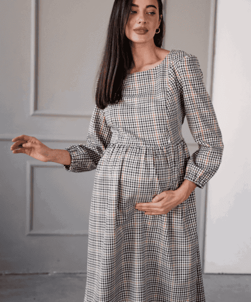 Женственное платье в клетку для беременных и кормящих. Длина миди, присборенные рукава, декоративные пуговицы сзади и бант на талии придают этому платью особое очарование. Для кормления малыша предназначены незаметные вертикальные молнии.