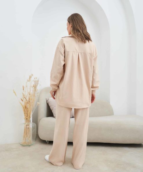 Подойдут на весь период беременности и после. В комплект к брюкам вы можете приобрести Бежевую рубашку Breeze