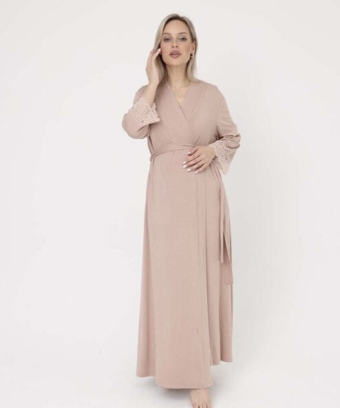 Ночная сорочка украшена кружевом, кокетка выполнена на запах, что делает её еще более удобной для молодых мам. Халат украшен кружевом, выполнен на запах.