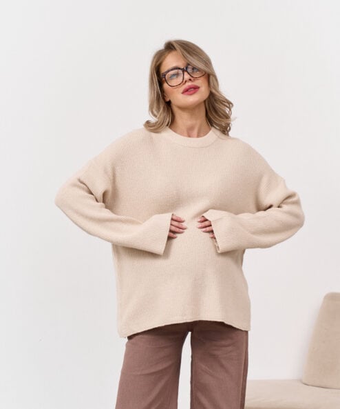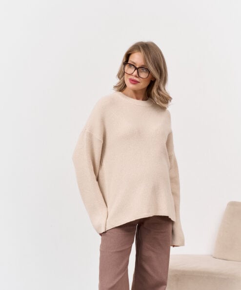 Базовый джемпер с круглой горловиной и спущенной линией плеч, который подойдет на любой срок беременности и после. Мягкая эластичная вязка и натуральный состав пряжи подарят комфорт в любое время года.
