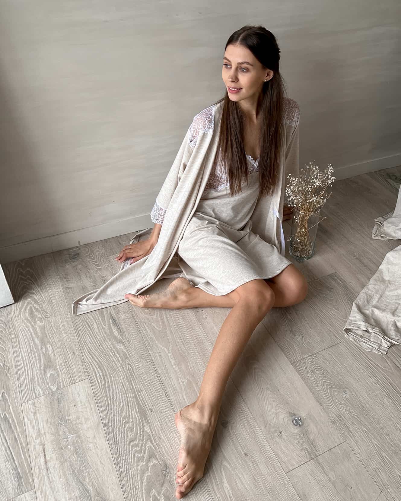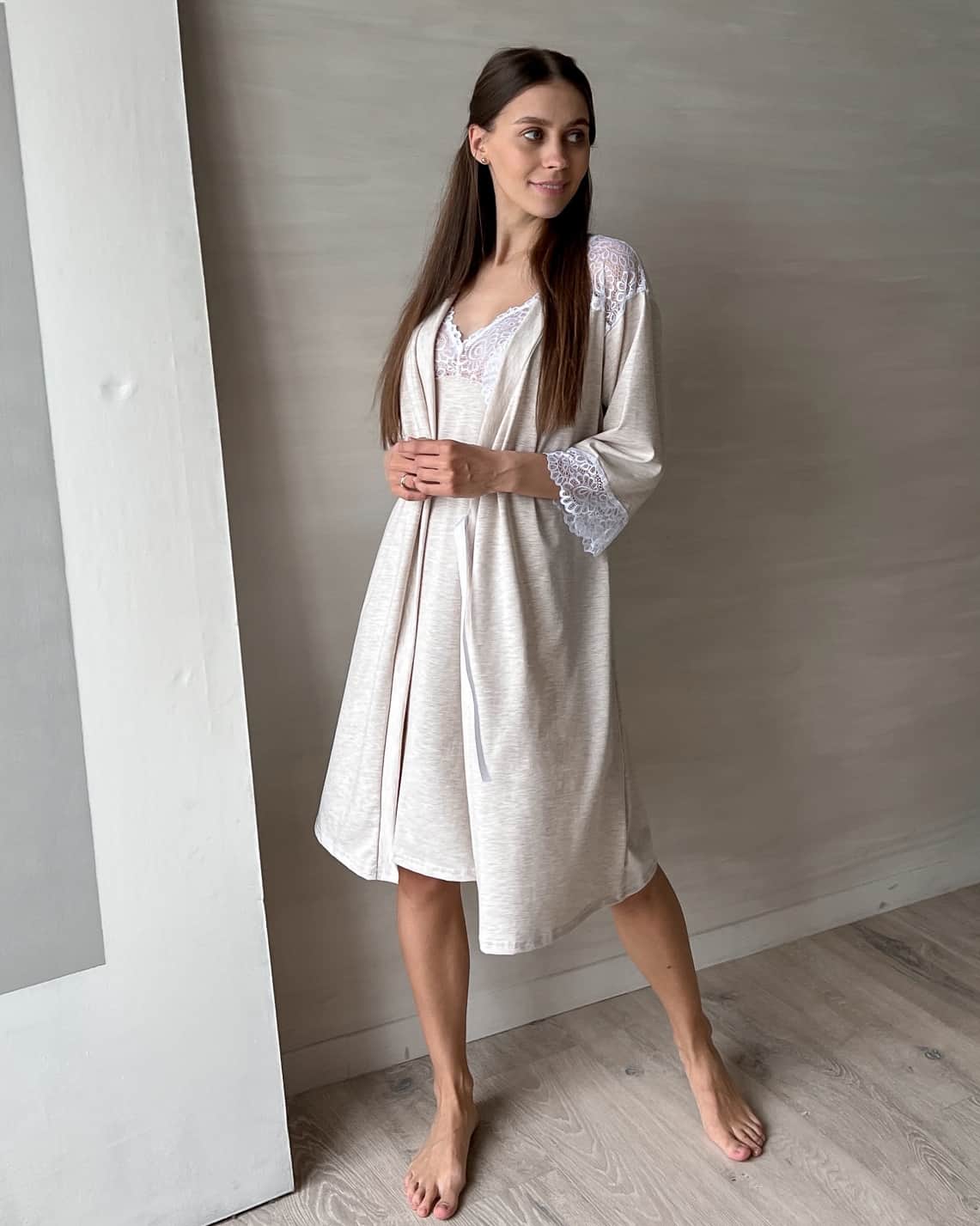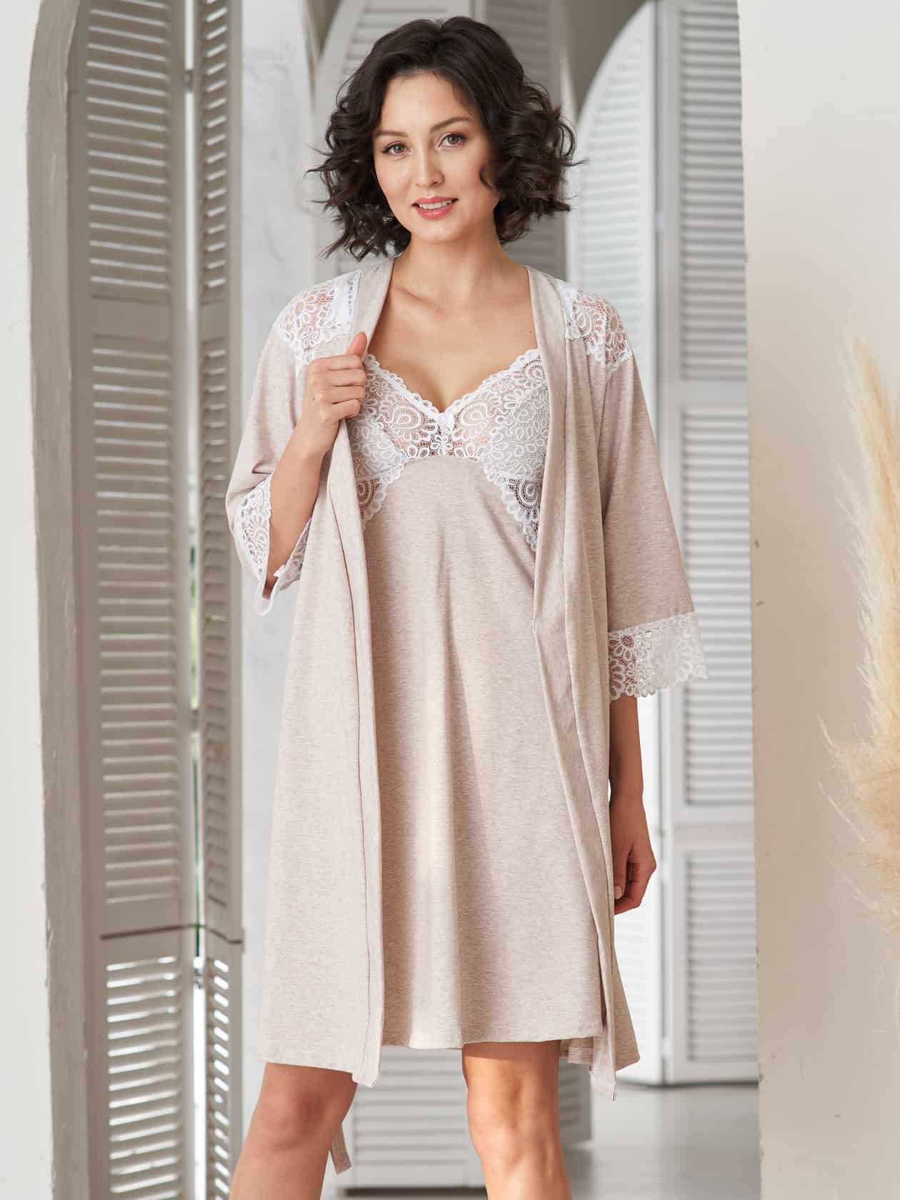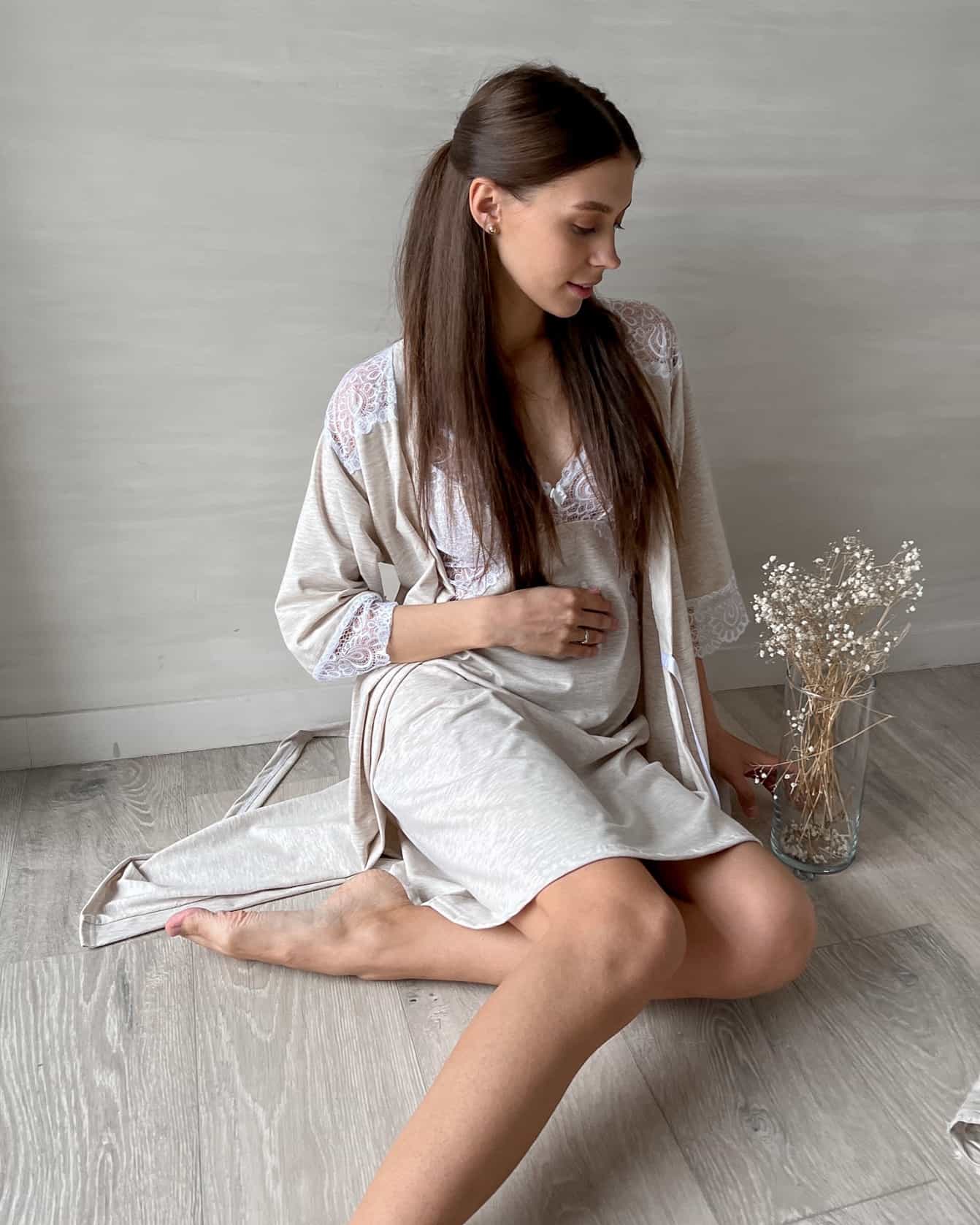 Очаровательный комплект для будущих и кормящим мам (сорочка и халат) из хлопка высочайшего качества «пенье» с добавлением лайкры. Отделка мягким кружевом добавляет комплекту шарма. Сорочка имеет отстегивавшуюся на клипсе бретель для доступа к груди во время кормления.