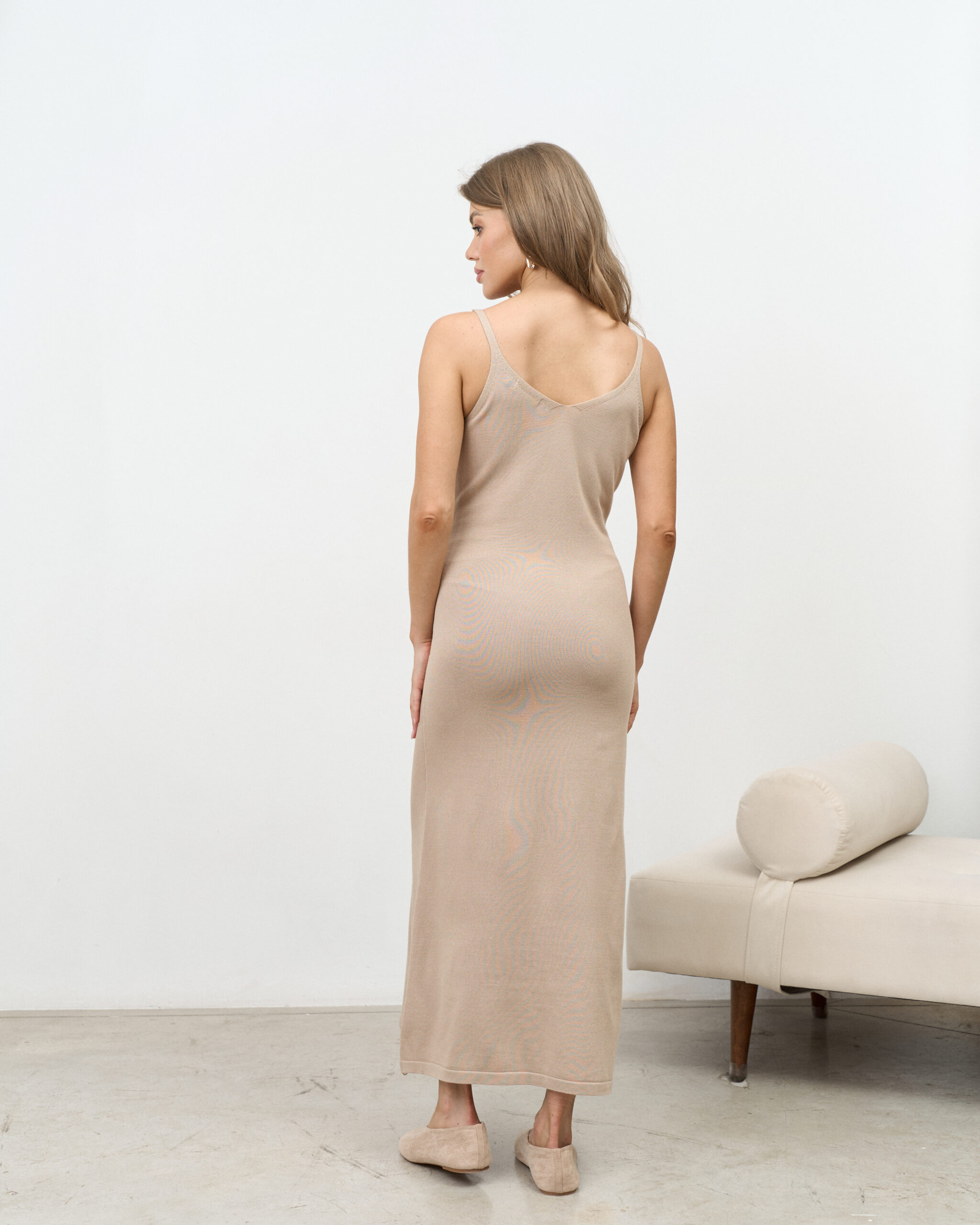 Стильный трикотажный комплект, состоящий из платья в длине макси на бретелях и свободного кардигана. Модный фасон стройнит и визуально вытягивает фигуру.