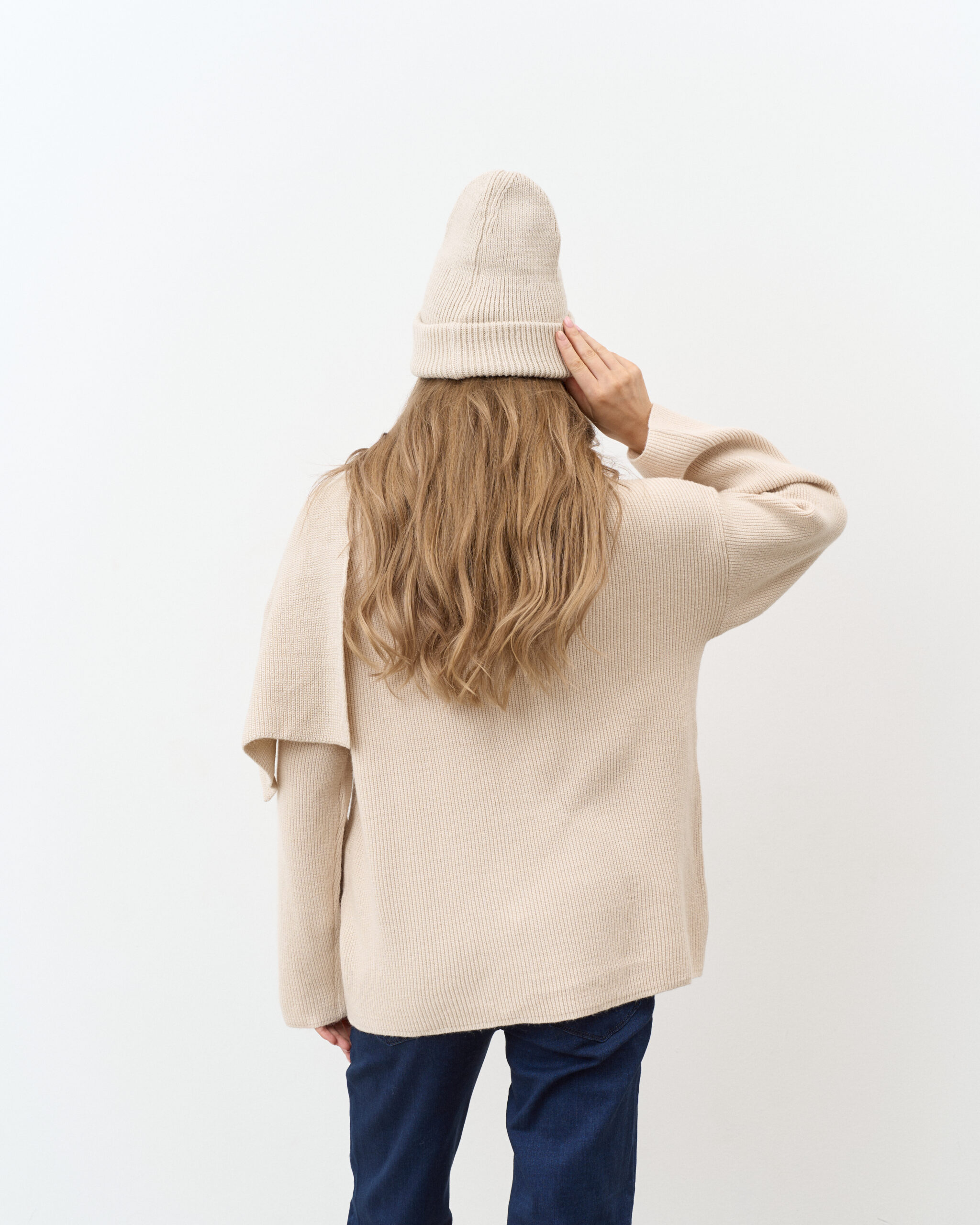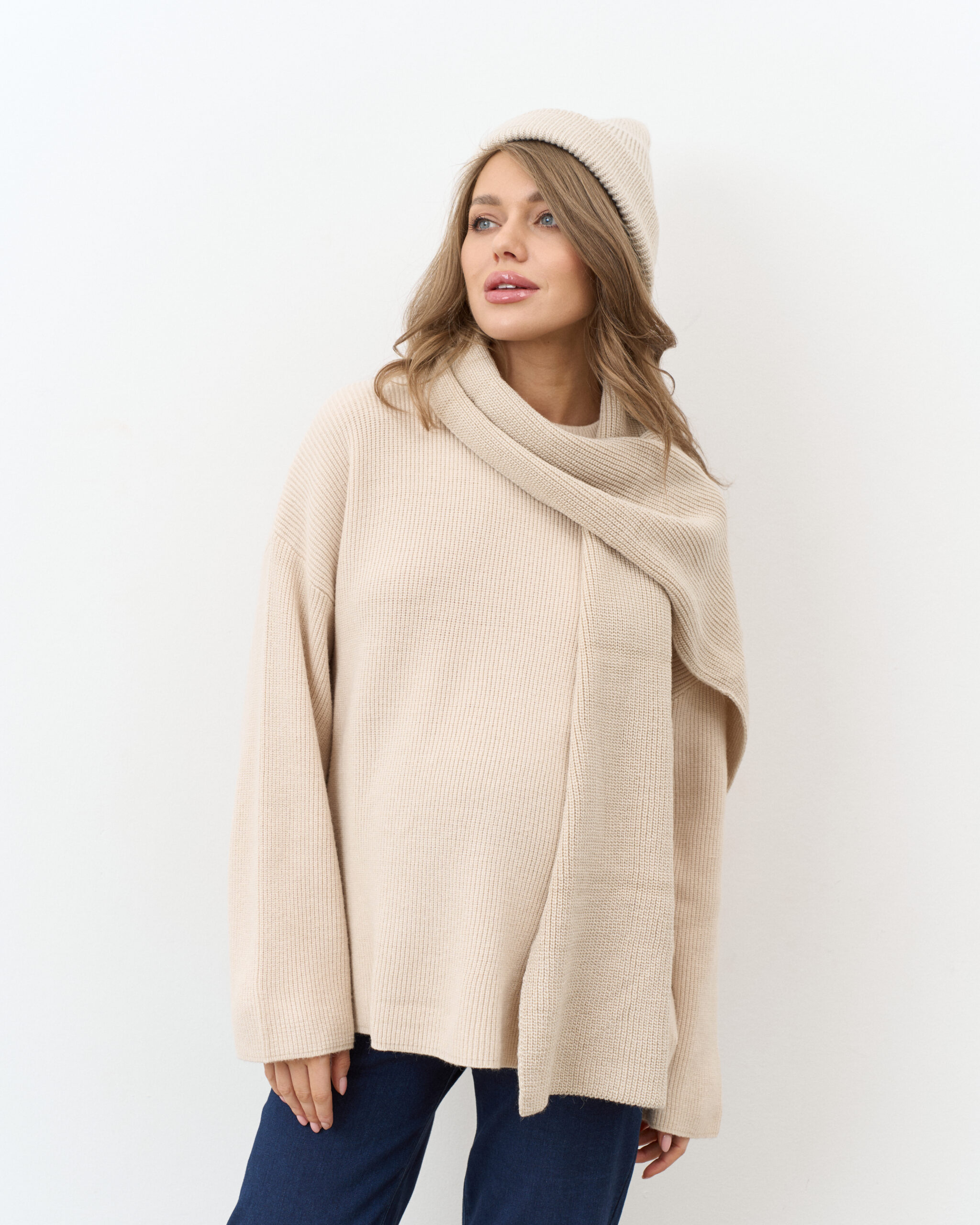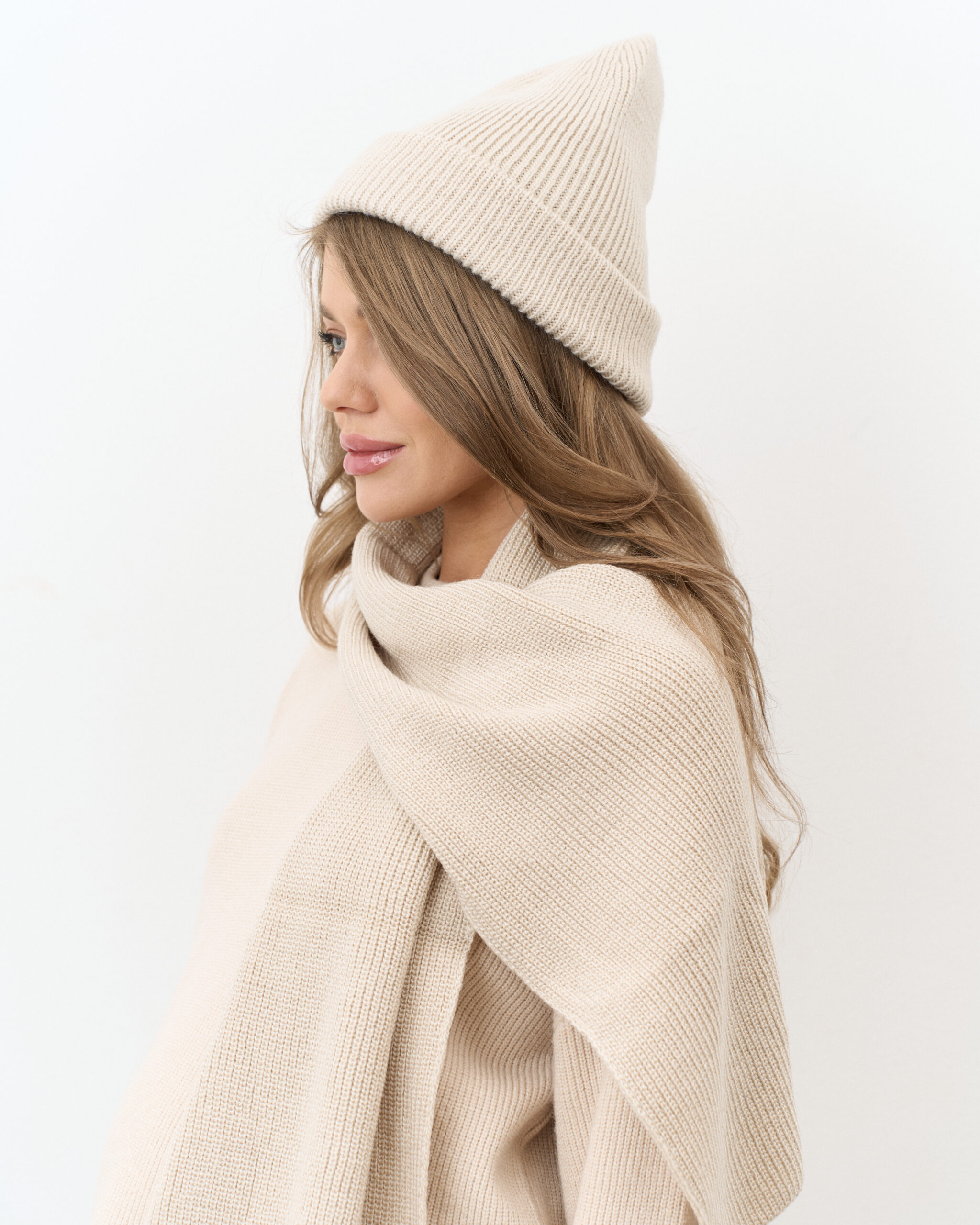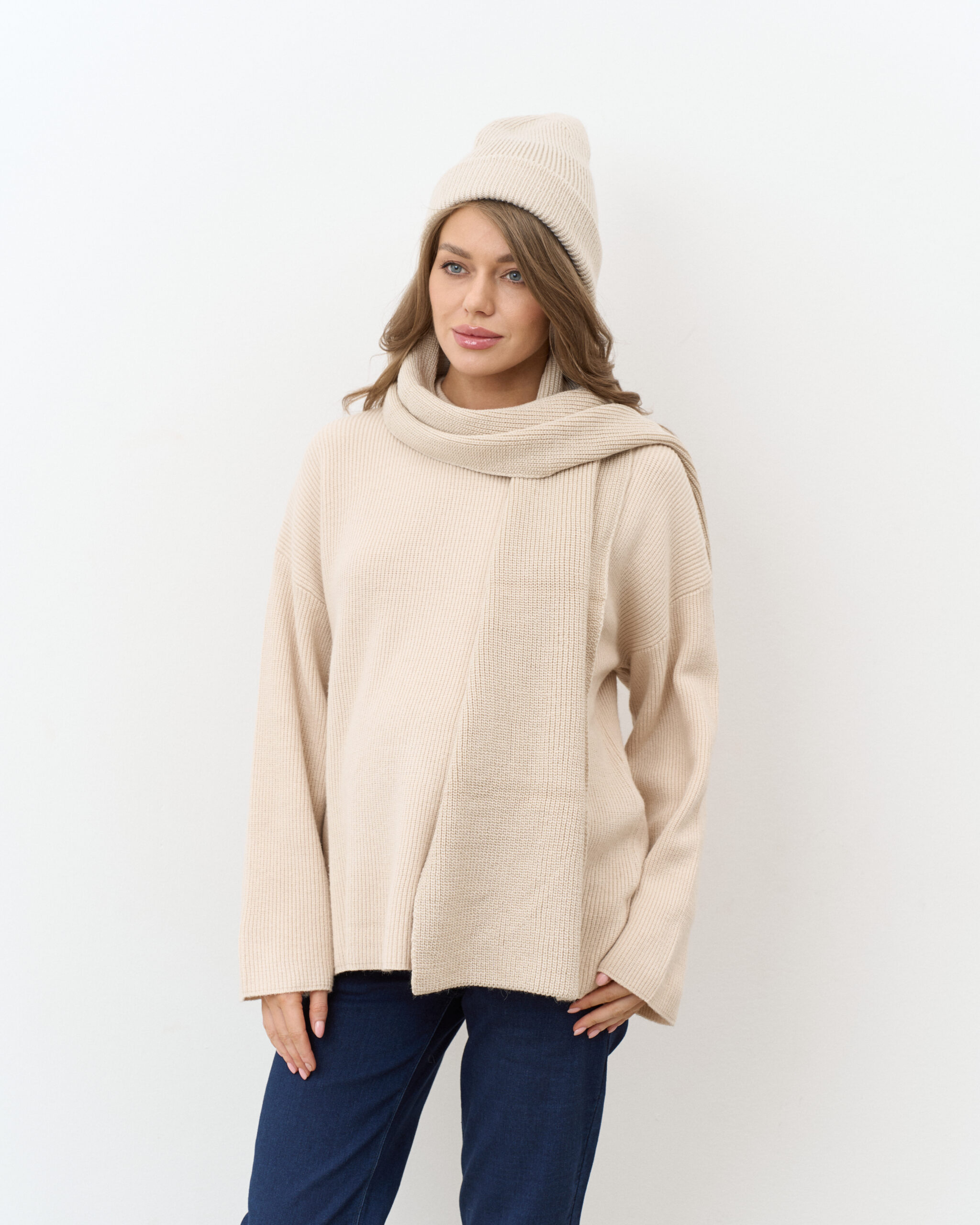 Незаменимый комплект для прохладной погоды, состоящий из шапки-бини и длинного шарфа. Не колется и не скатывается. Подходит на погоду от -10 до +10 градусов