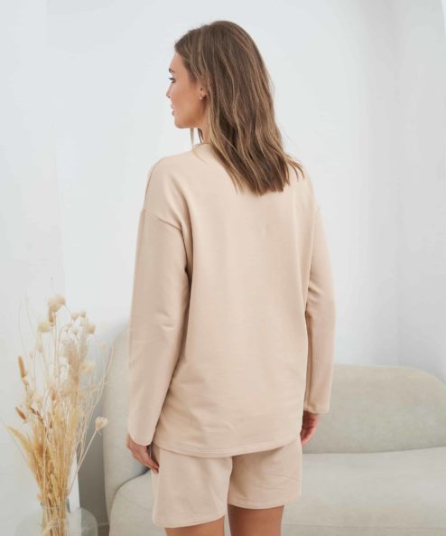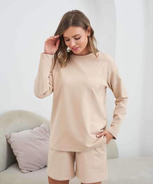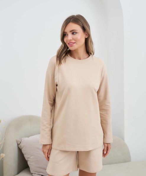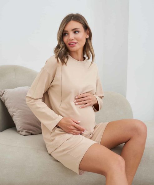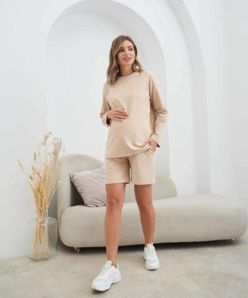 Трикотажный костюм для беременных и кормящих мам из лёгкой хлопковой ткани состоит из мягких свободных шорт с удобной резинкой на кулиске и свободного свитшота с карманами для кормления.