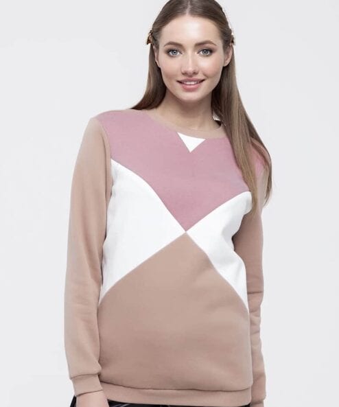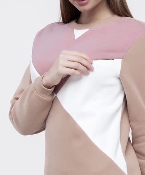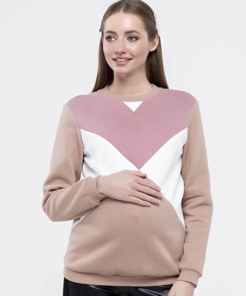 Ультрамодный теплый свитшот для беременных и кормящих из трикотажатрехнитка с начесом в стиле color-block. Сочетание трёх цветов ткани так и притягивает взгляд, а секреты для кормления очень удачно замаскировались в нагрудных рельефах (незаметные потайные молнии).