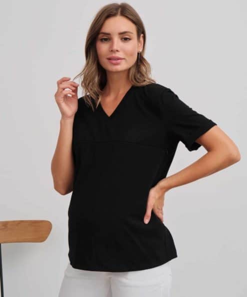 Футболка актуального кроя оверсайз из хлопкового трикотажа с v-образным вырезом. Подойдет для любого срока беременности и после. Секрет кормления: горизонтальная потайная молния.