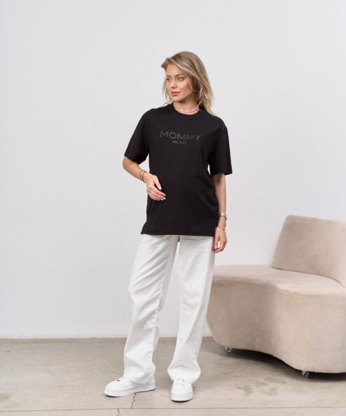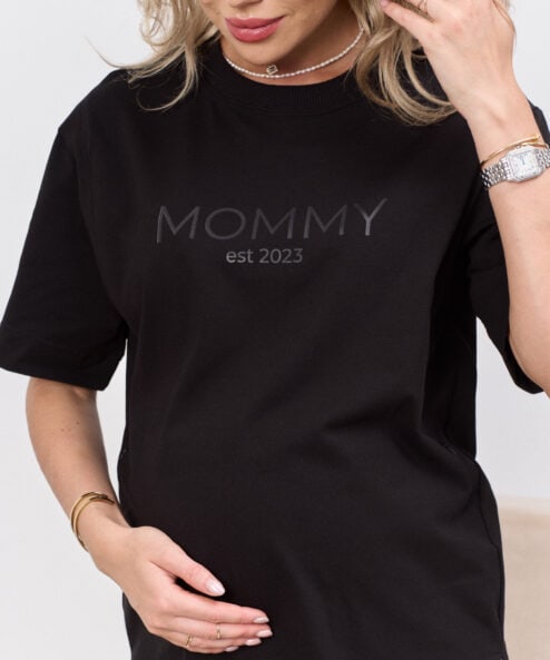 Футболка актуального кроя оверсайз из хлопкового трикотажа с принтом MOMMY est 2023. Подойдет для любого срока беременности и после. Для кормления малыша выполнены удобные вертикальные молнии.