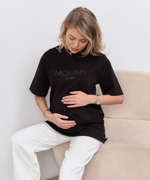 Футболка актуального кроя оверсайз из хлопкового трикотажа с принтом MOMMY est 2024. Подойдет для любого срока беременности и после. Для кормления малыша выполнены удобные вертикальные молнии.