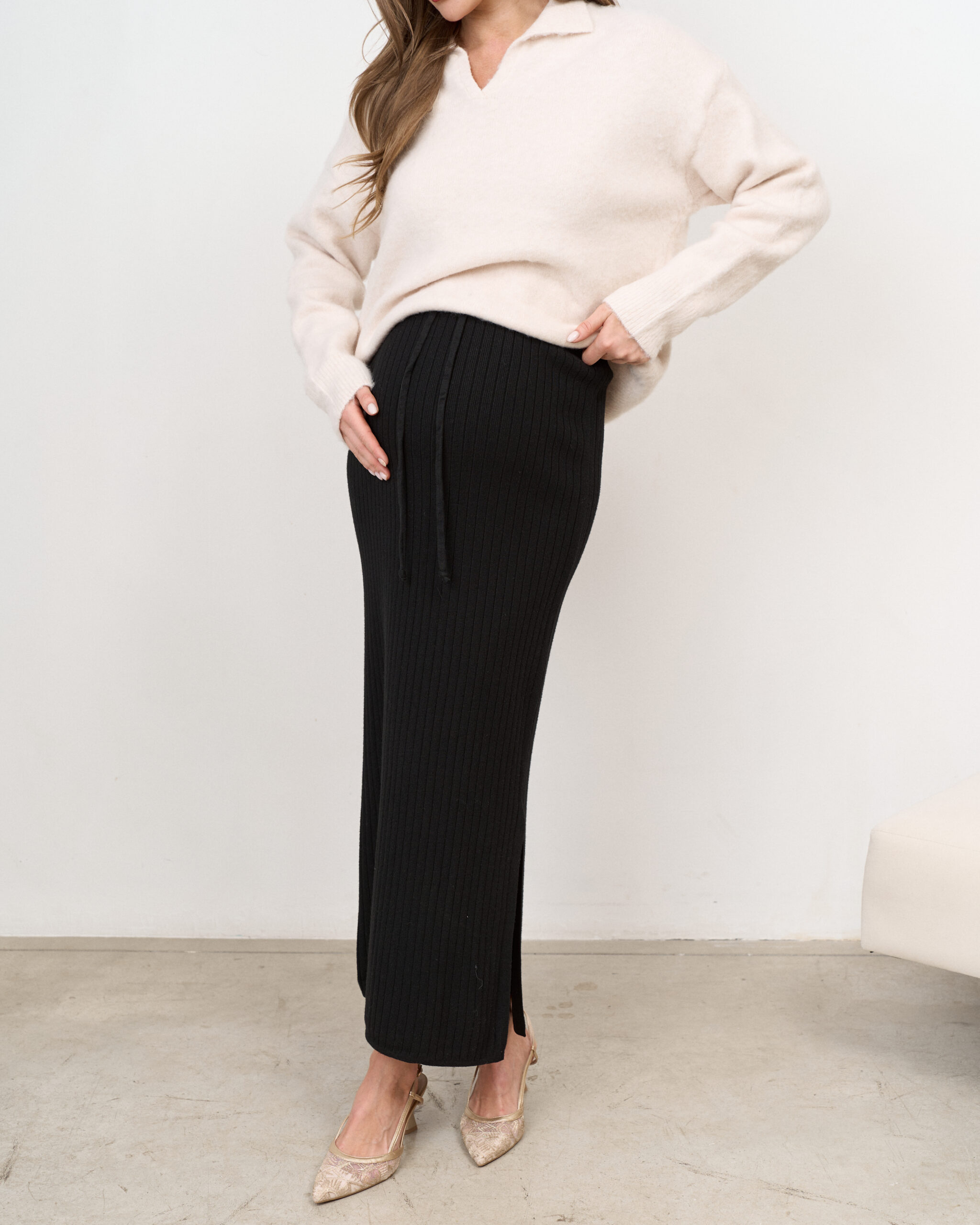 Стильная юбка в длине миди из трикотажной ткани с разрезом. Мягкий эластичный пояс позволит носить юбку на любом сроке беременности и после.