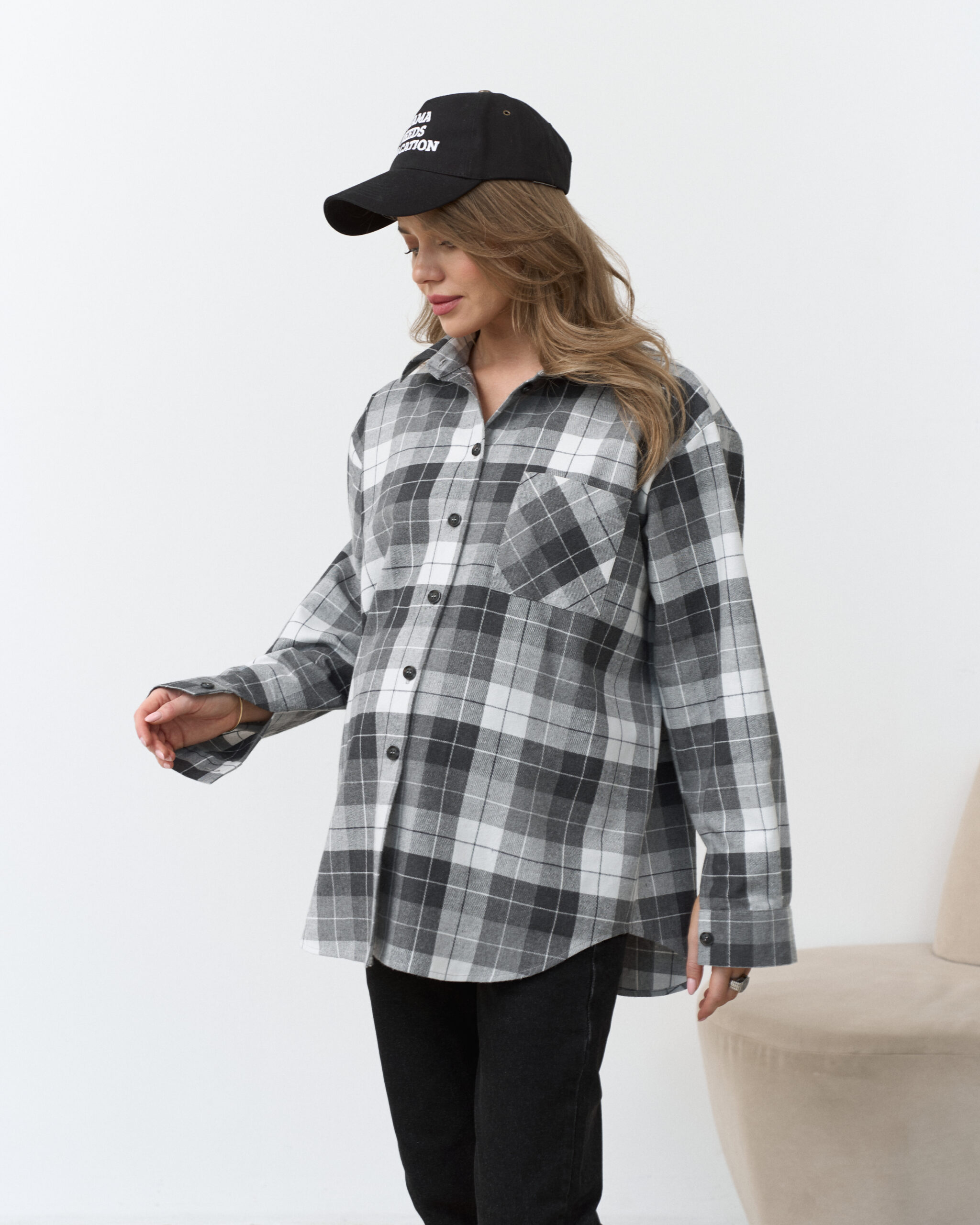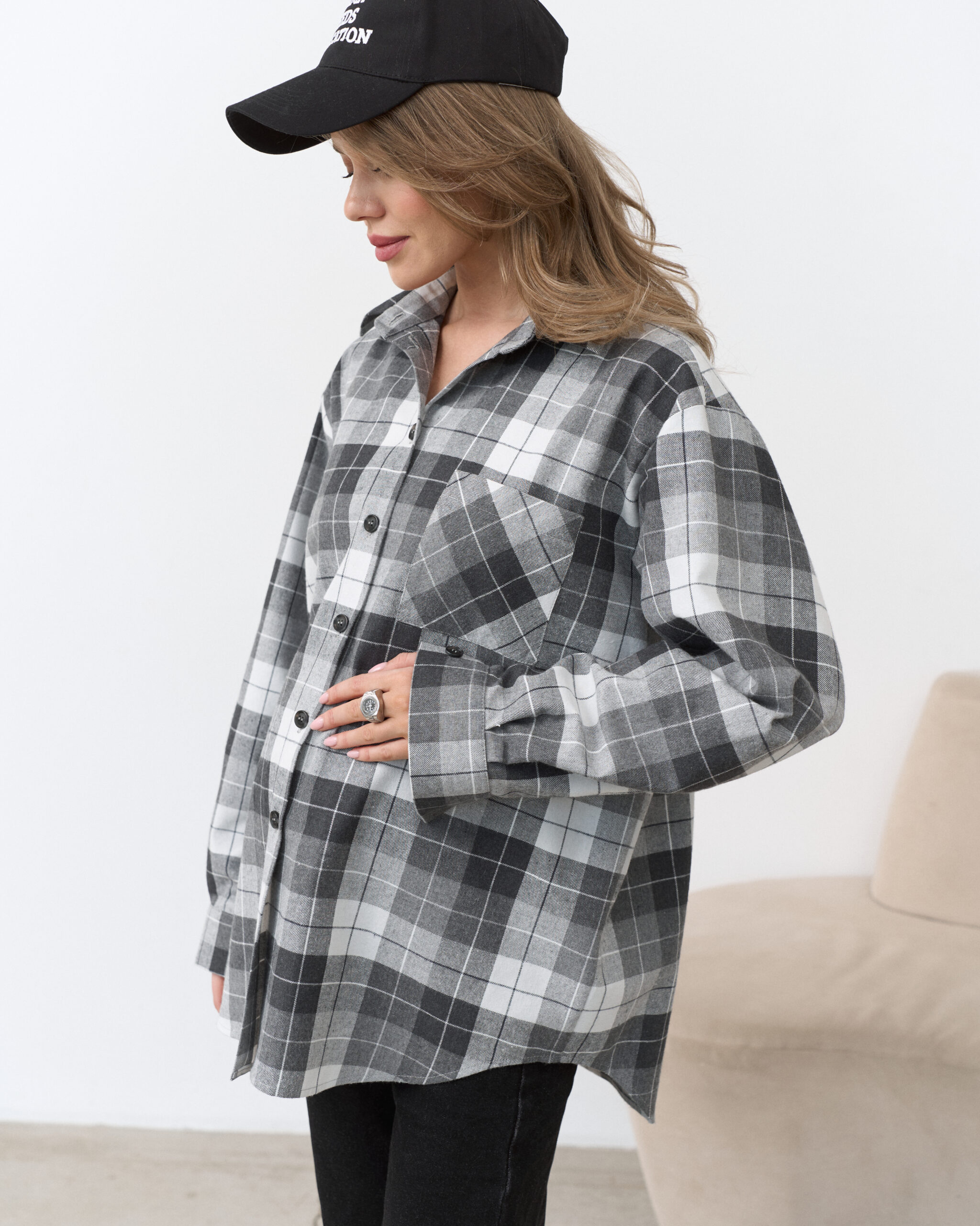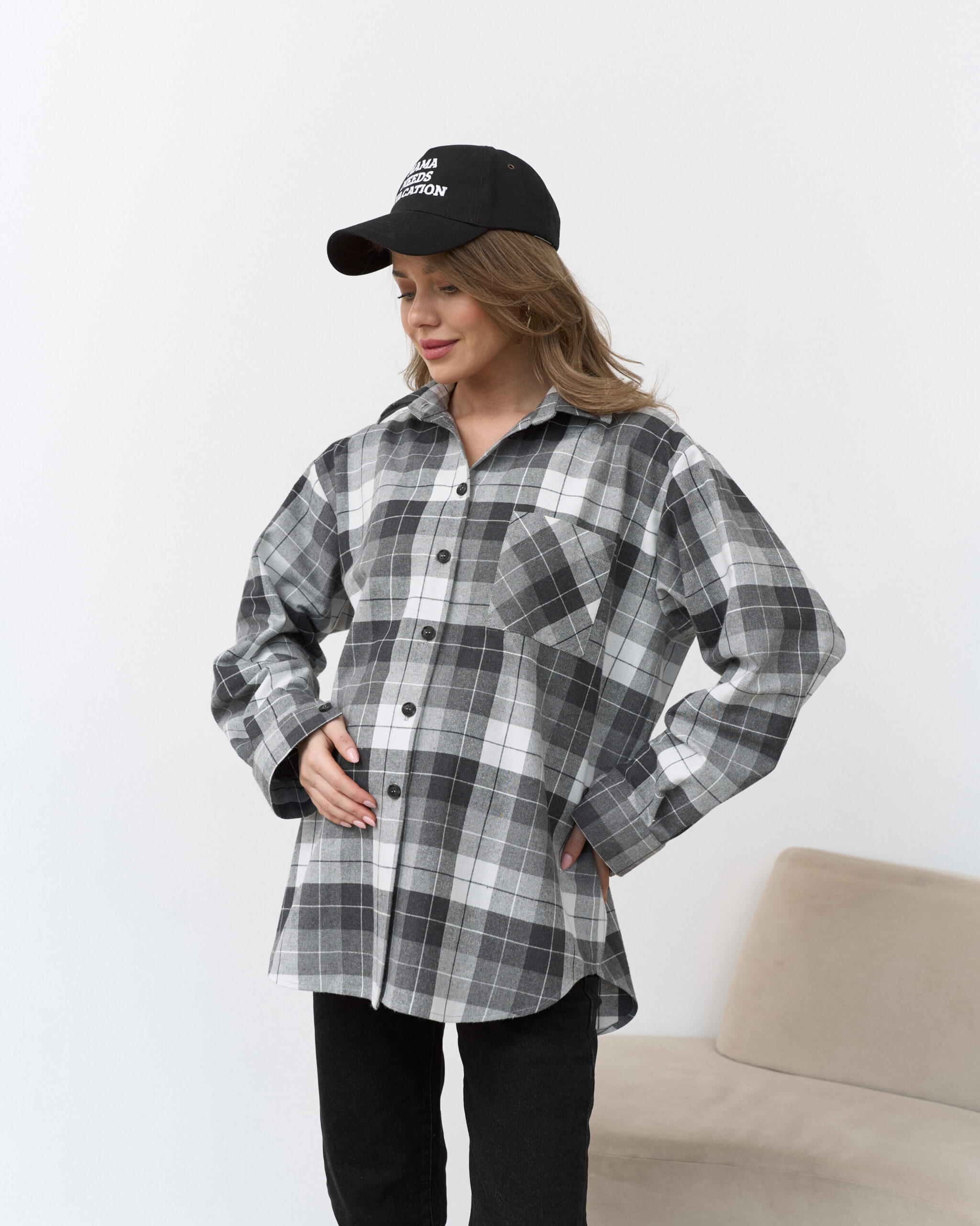 Стильная удлиненная рубашка в клетку, которая подойдет на весь срок беременности и после. Такую рубашку можно сочетать с брюками, шортами, джинсами и даже платьями. А натуральный состав ткани подарит комфорт в любой ситуации.