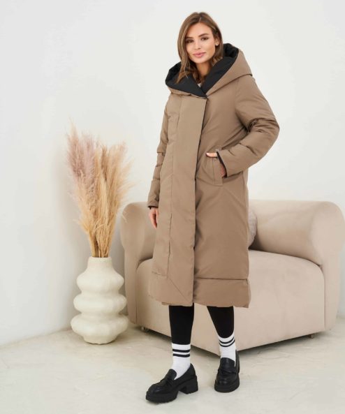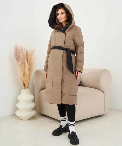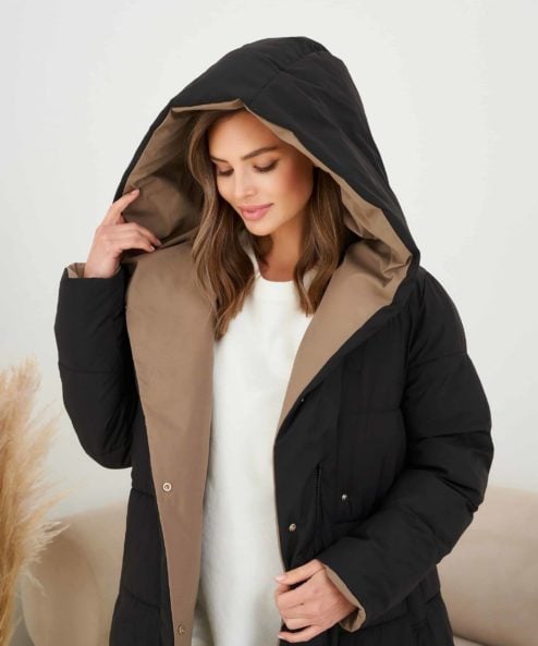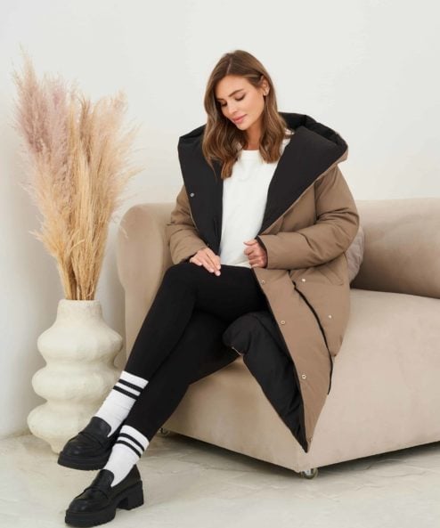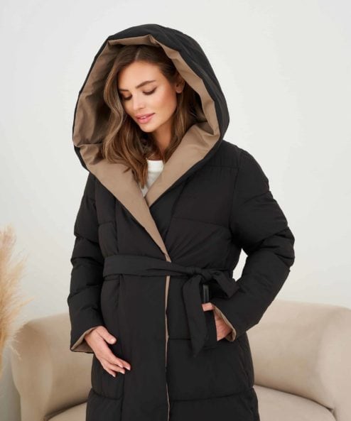 Невероятно теплое и стильное зимнее пальто, которое подойдет на весь срок беременности и после. Приятный бонус — можно надевать черной либо бежевой стороной — под ваше настроение и образы. Детали: вместительные карманы с обоих сторон, пояс в комплекте, кнопки, объемный капюшон.