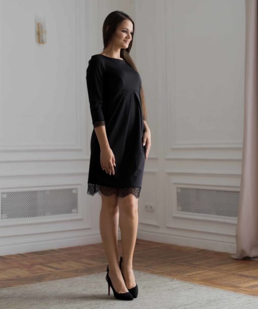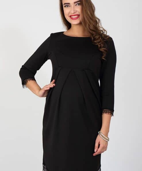 Вечернее платье для кормления из трикотажа джерси. Секрет кормления спрятан в нагрудных рельефах (потайные молнии). Оригинальный фасон прекрасно подчеркнет достоинства вашей фигуры и исключительный вкус обладательницы. Платье по низу рукава и изделия украшено утонченным кружевом шантильи, на спинке — красивый вырез и бант из атласной ленты.