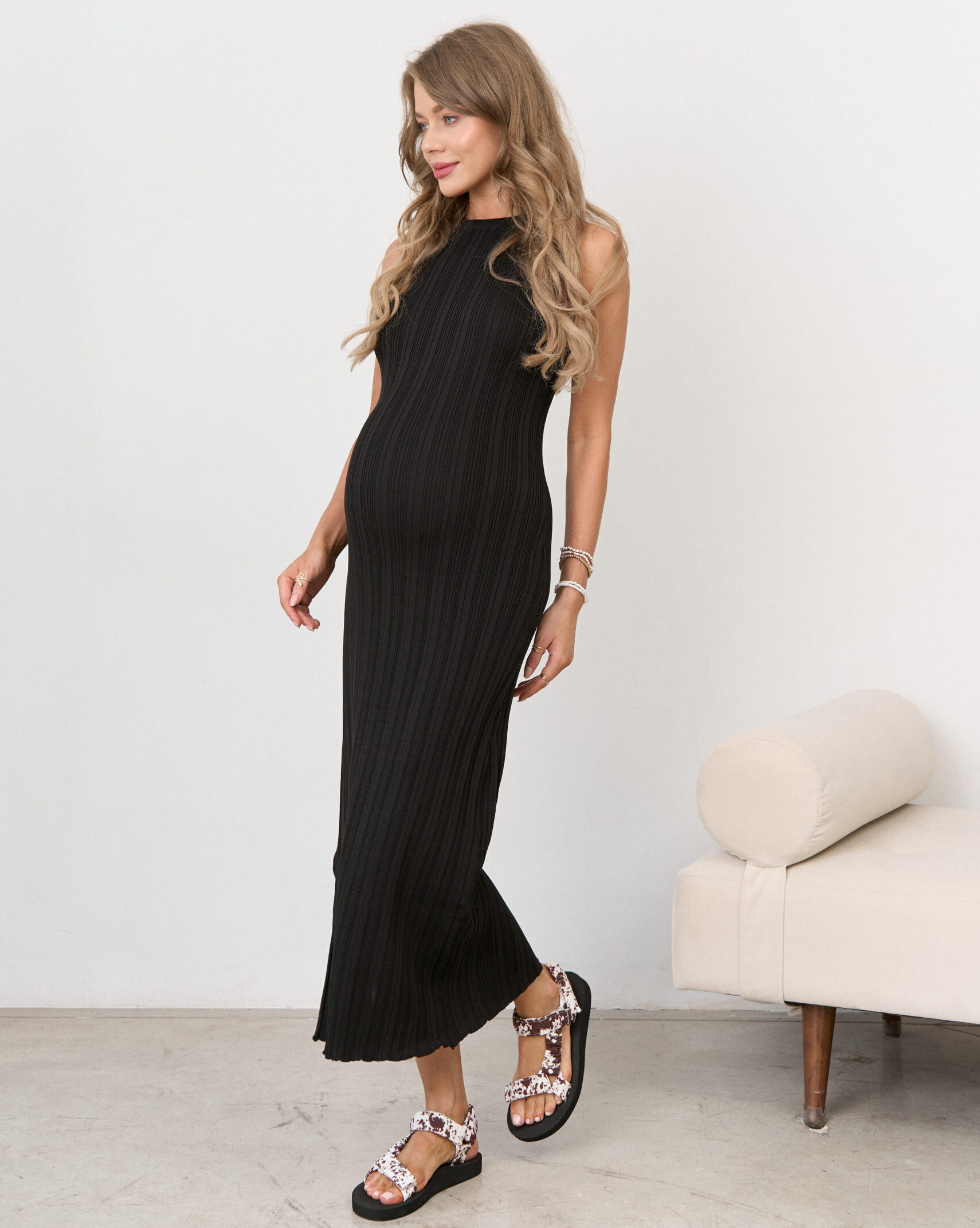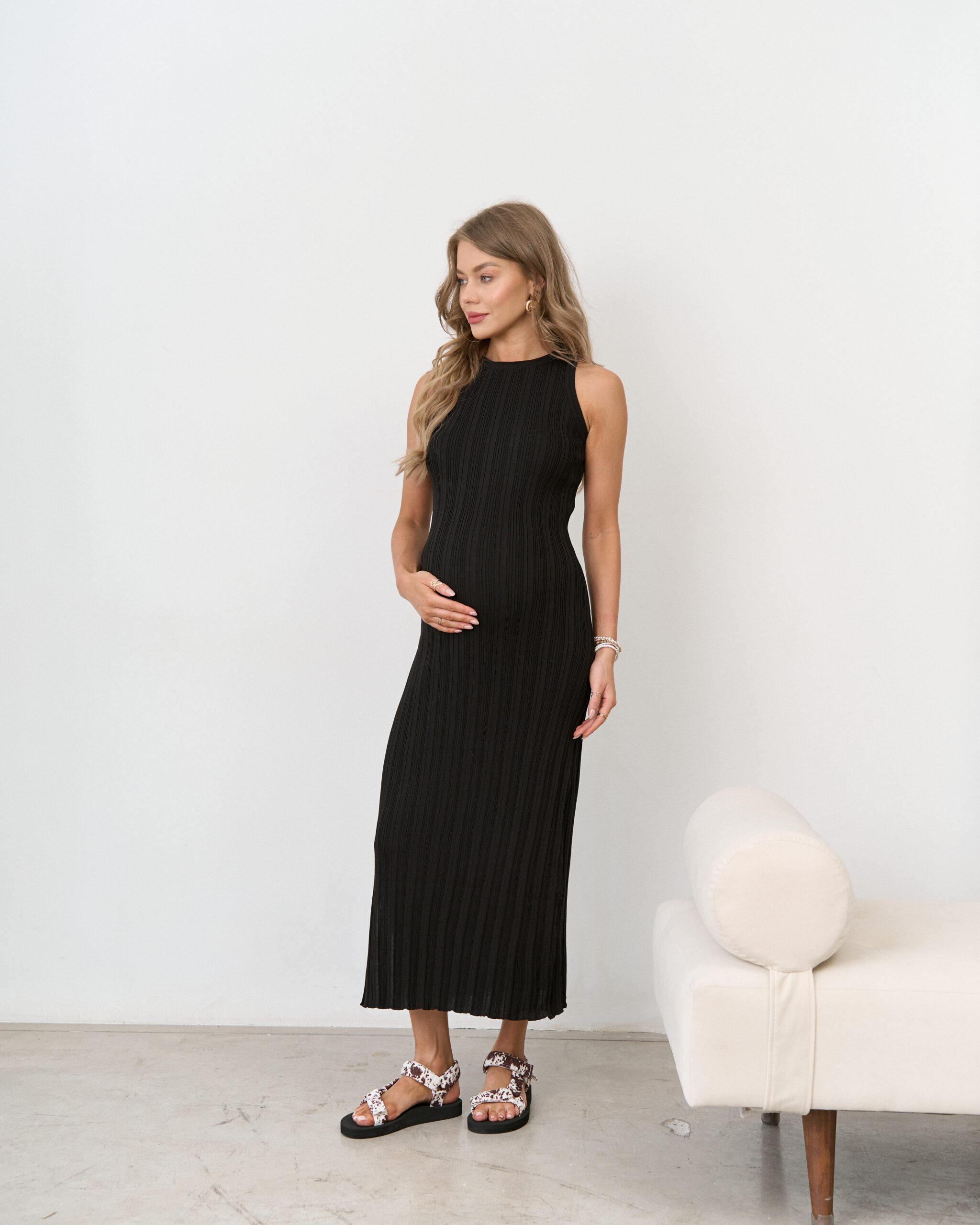 Трендовое трикотажное платье в длине миди из мягкой вискозной пряжи. Благодаря эластичной вязке платье отлично подойдёт на весь срок беременности и после.