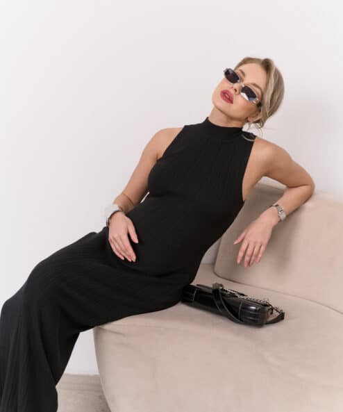 Трендовое трикотажное платье в длине миди из мягкой вискозной пряжи. Благодаря эластичной вязке платье отлично подойдёт на весь срок беременности и после. Рекомендуем для размеров 42-48.