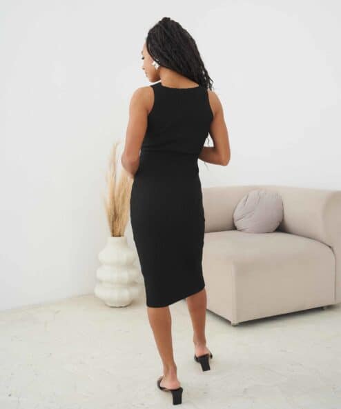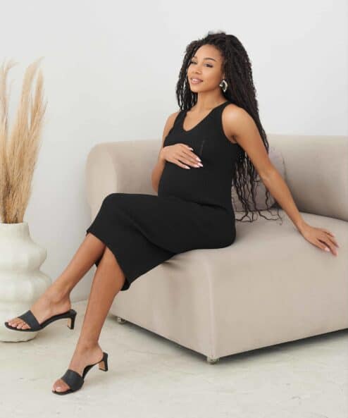 Трикотажное платье в длине миди из хлопковой пряжи. Благодаря эластичной вязке подойдёт на весь срок беременности и после.