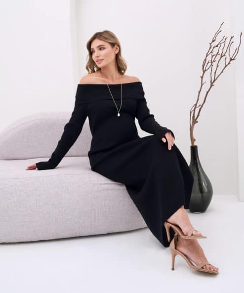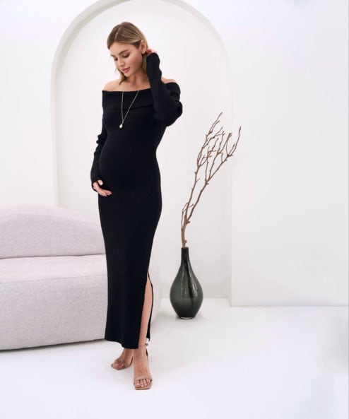Трендовое платье из трикотажа-лапша с открытыми плечами и боковым разрезом. В нем вы будете выглядеть эффектно и стильно, а высокая эластичность материала позволит носить это платье на протяжении всего периода беременности и после нее Без секретов для кормления.