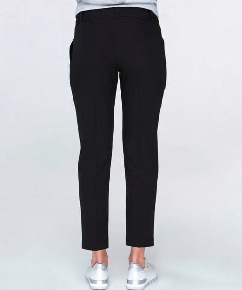 Модные брюки-чинос из стрейч-поплина модной длины «до щиколотки». На полочке верху складки и косые карманы, по кругу — кокетка со шлевками, внизу — подвороты. Зауженный к низу крой стройнит. Универсальный бандажный пояс позволяет носить модель после беременности.