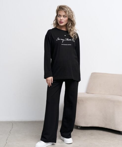 Брюки актуального прямого кроя для будущих и кормящих мам. Ткань — футер-трехнитка высшего качества «пенье». Пояс брюк мягкий и эластичный, под живот, что позволяет носить их на любом сроке беременности и после. Бандажный пояс выполнен из рибаны. В комплект к брюкам вы можете приобрести черное худи Juna