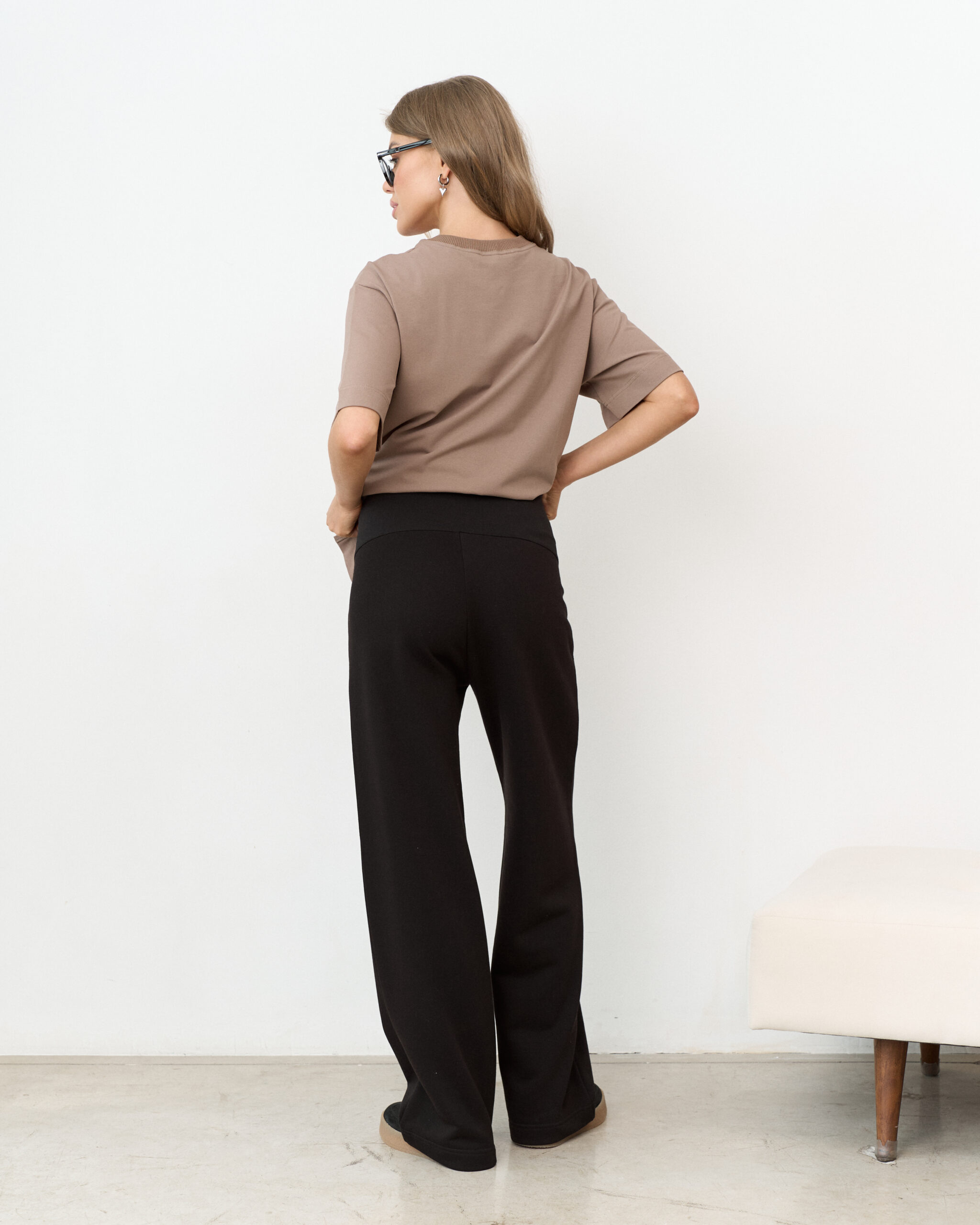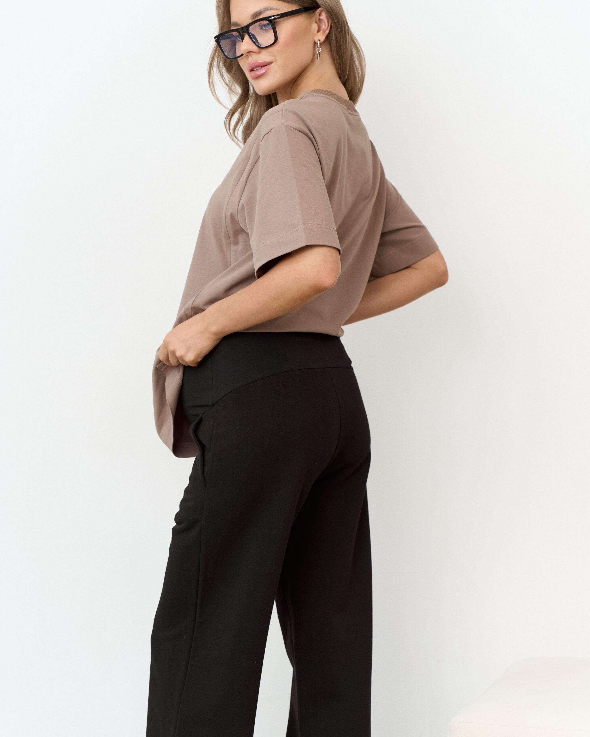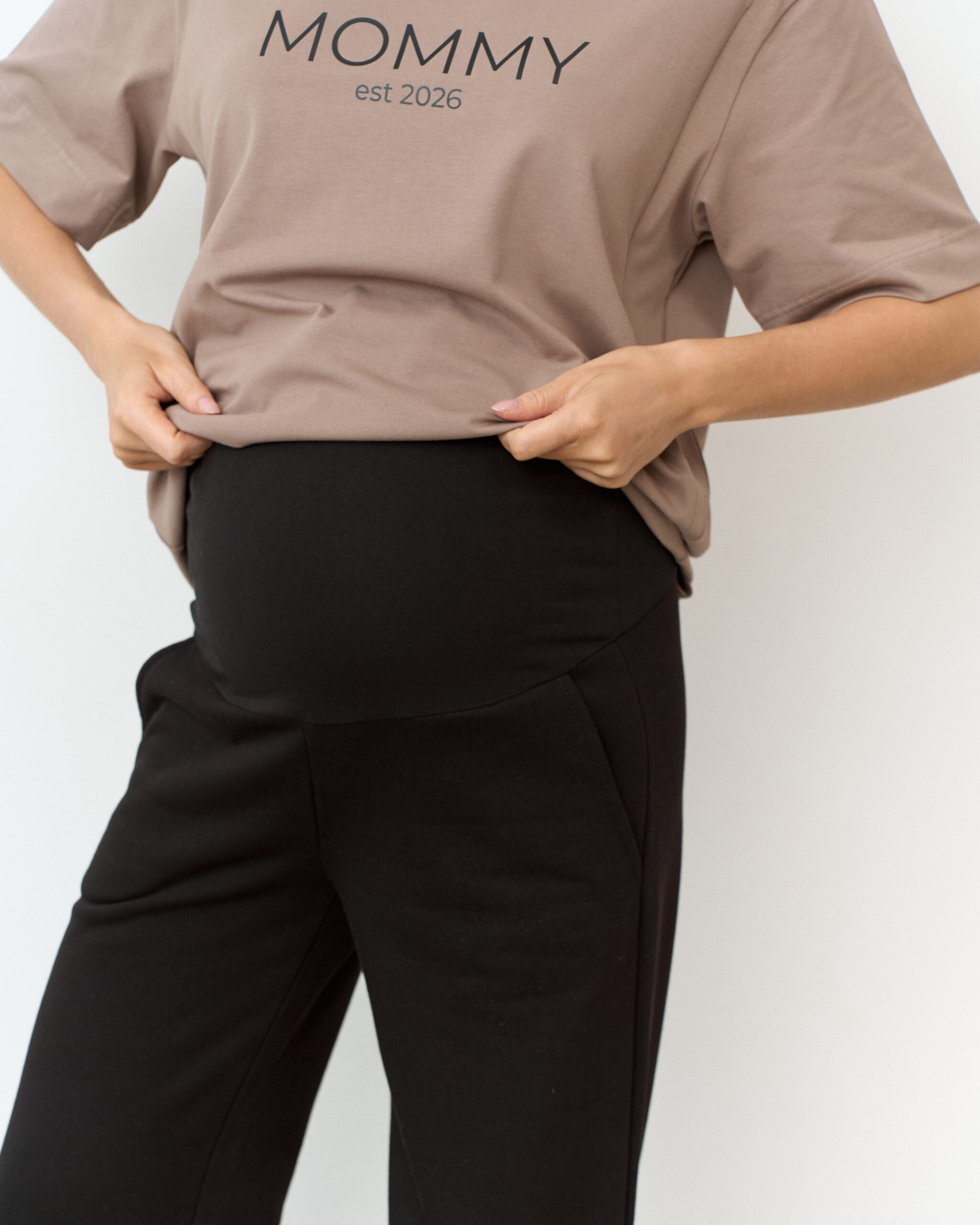 Брюки выполнены из футера-трехнитки высшего качества «пенье». Специально разработанный напузник, благодаря которому их можно носить всю беременность и после. Удобные и вместительные карманы по бокам, что особенно актуально для мам.