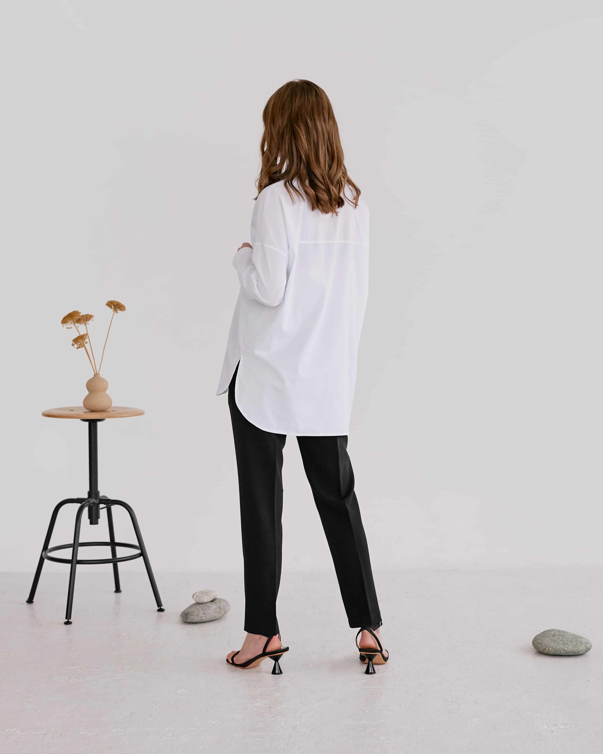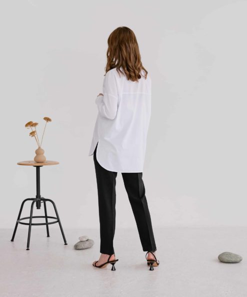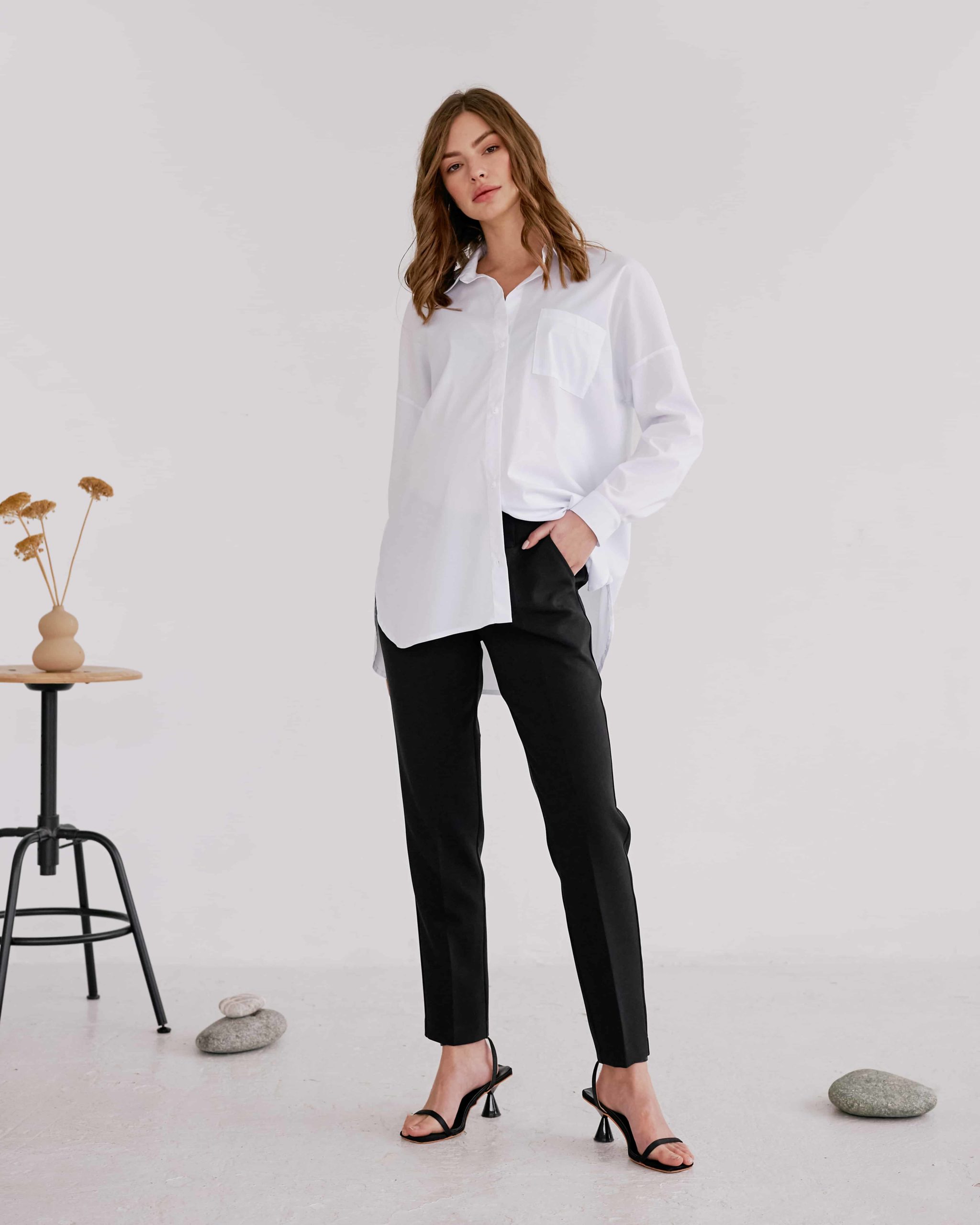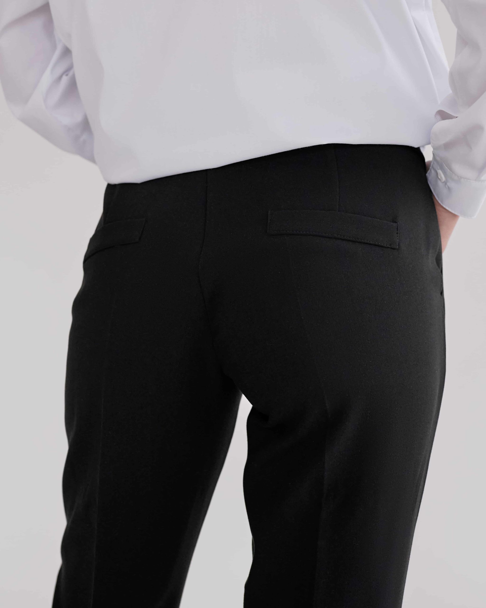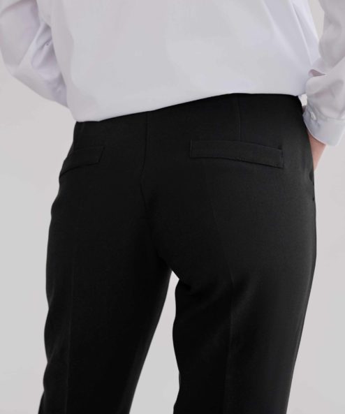 Стильные классические брюки модной длины до щиколотки. Выполнены из плотной костюмной ткани, которая прекрасно держит форму. Зауженный к низу фасон в сочетании с заутюженными стрелками прекрасно стройнит фигуру. На задней половинке брюк — прорезной карман-обманка. Бандажный пояс хорошо поддерживает животик и позволяет носить эту модель и после беременности.