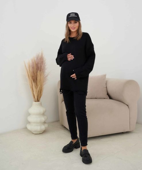 Этот стильный джемпер подойдет на весь период беременности и после. Мягкий состав пряжи подарит комфорт, а состаренный эффект (декоративные дыры в нижней части изделия) позволит создавать дерзкие и современные образы. Джемпер выполнен в идеальной длине для сочетания с леггинсами. Рост модели на фото — 169 см.
