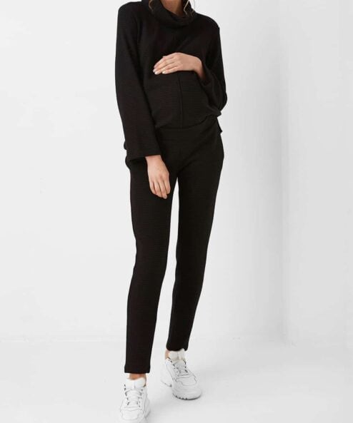 Трендовый базовый костюм из фактурного трикотажа для беременных и кормящих мам, состоящий из брюк и джемпера. Удлиненный крой джемпера и потайные молнии позволяют носить его как во время беременности, так и в период кормления. У брюк — мягкий пояс под растущий животик будущей мамы.