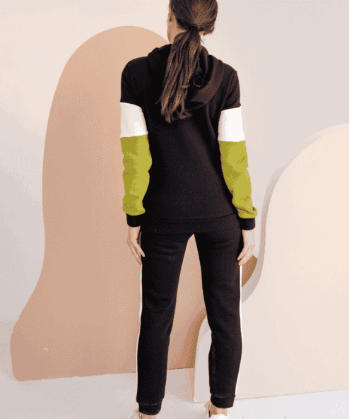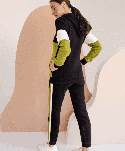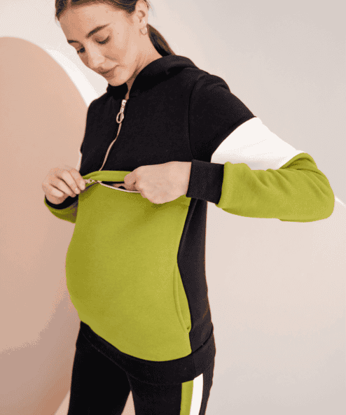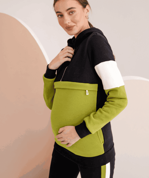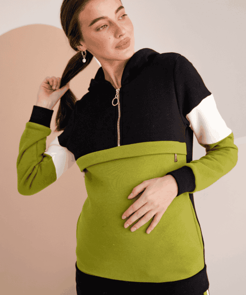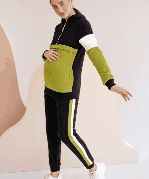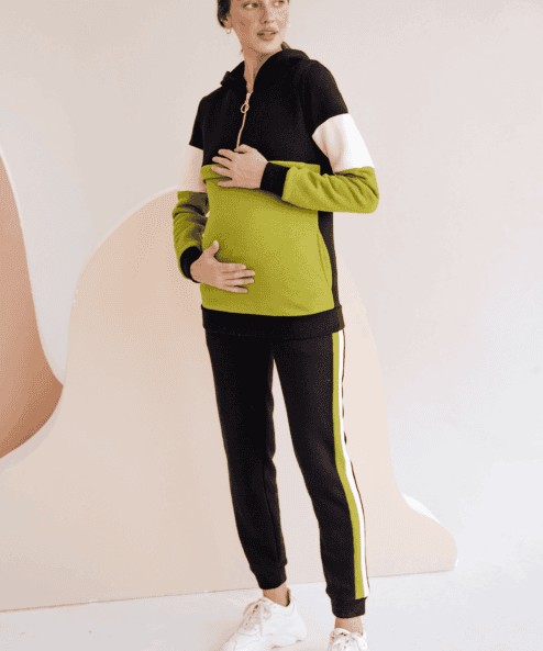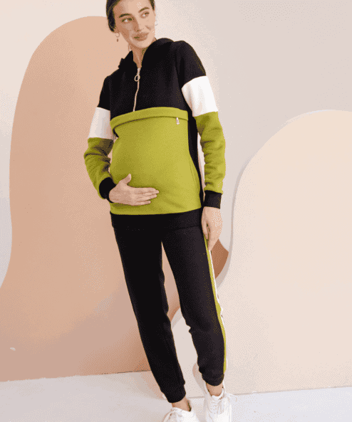 Трёхцветный спортивный костюм, сделанный из мягкого хлопкового материала с внутренним флисовым слоем. Свободная толстовка с капюшоном и брюки-джоггеры отлично смотрятся как в комплекте, так и по отдельности. Костюм прекрасно подойдет на все сроки беременности и для мамочек, кормящих грудью. Удобный секрет для кормления выполнен в виде горизонтальной молнии. Верх и низ костюма дополнены прорезными карманами.