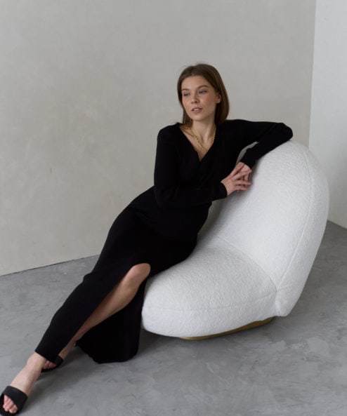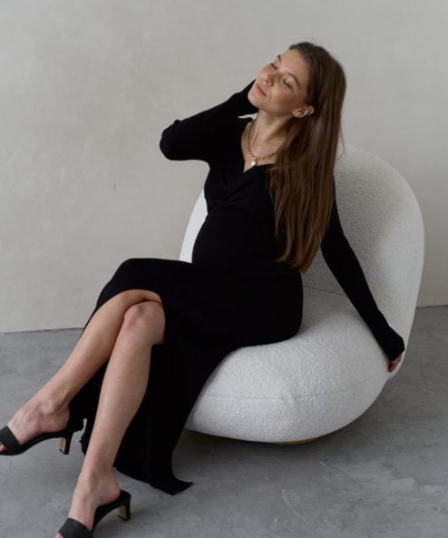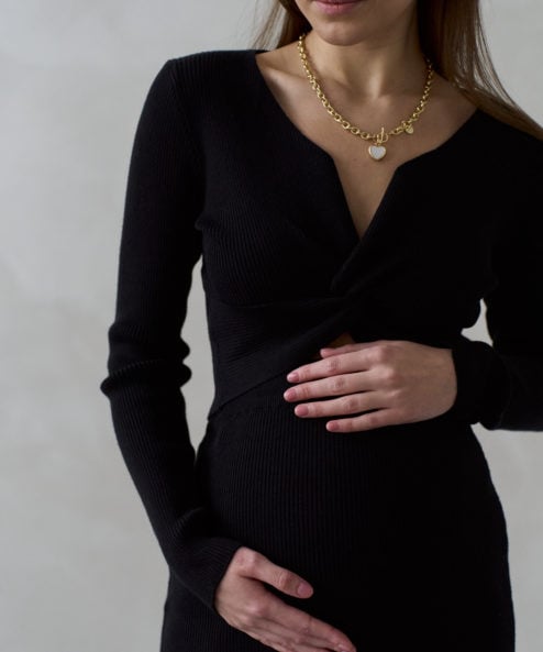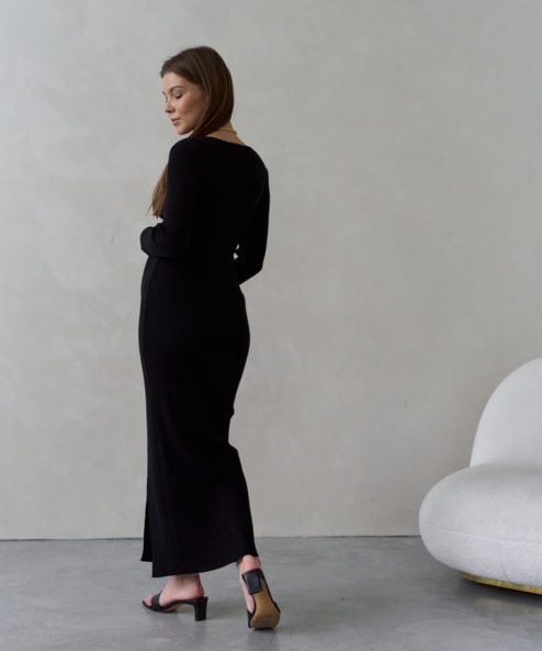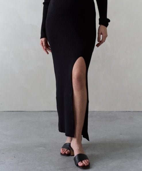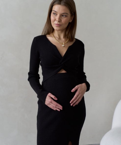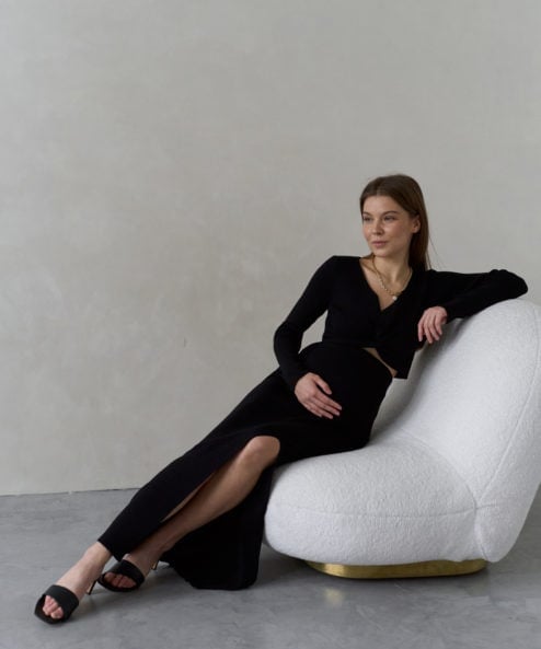 Стильный трикотажный костюм, состоящий из юбки с разрезом и топа с длинным рукавом. Модный фасон стройнит и визуально вытягивает фигуру. Подойдет на период беременности и после.