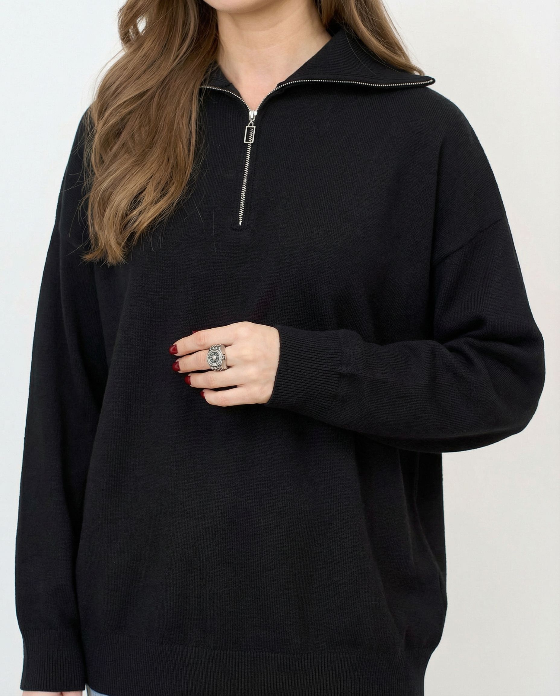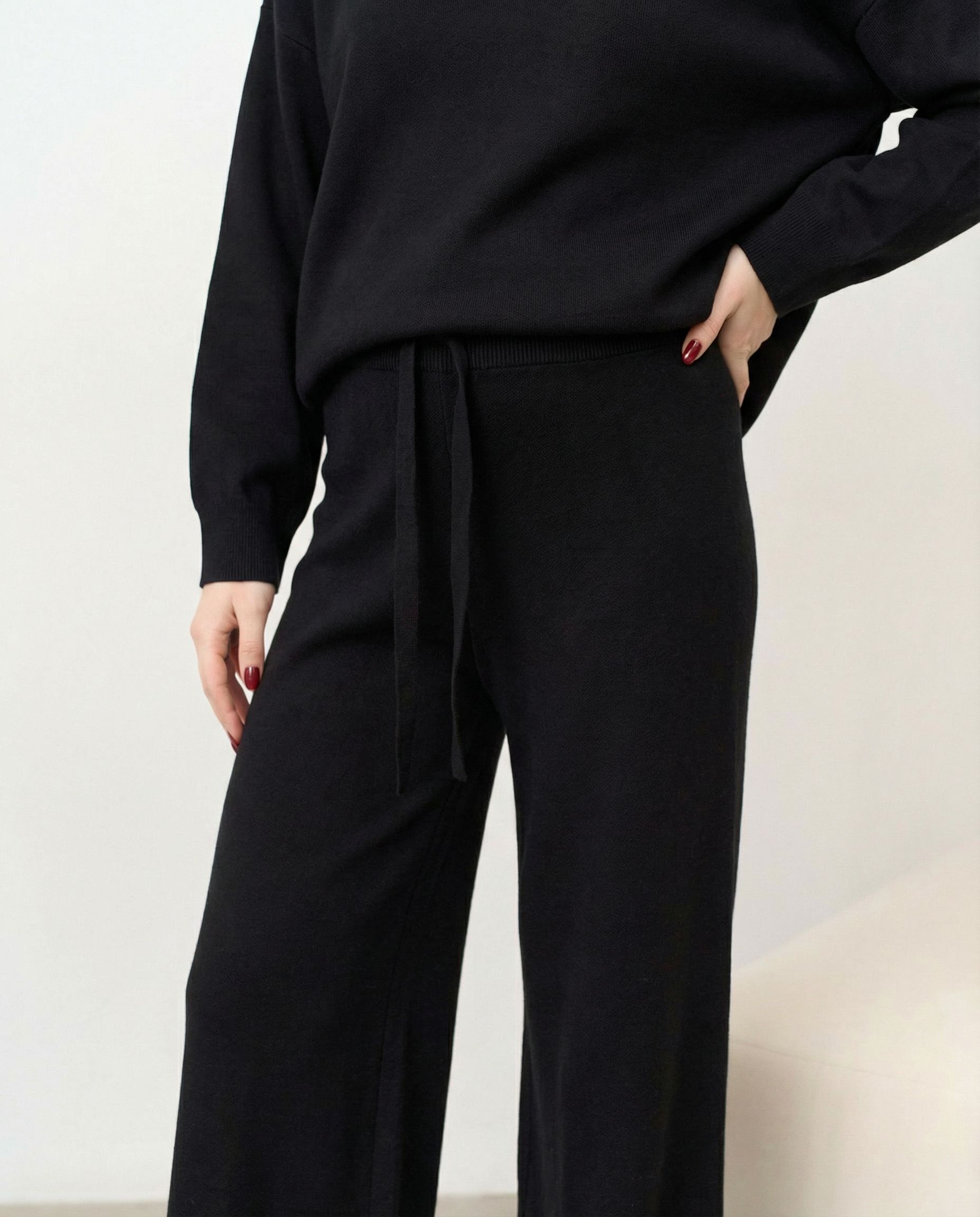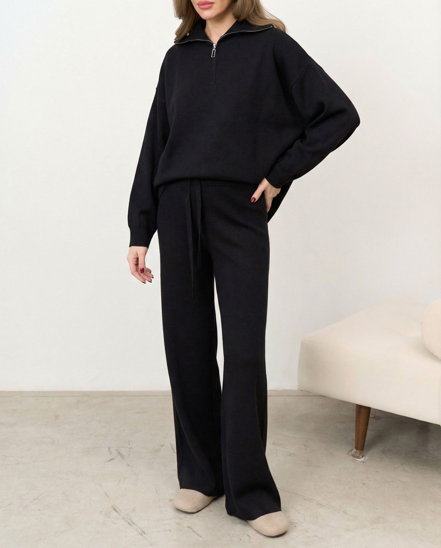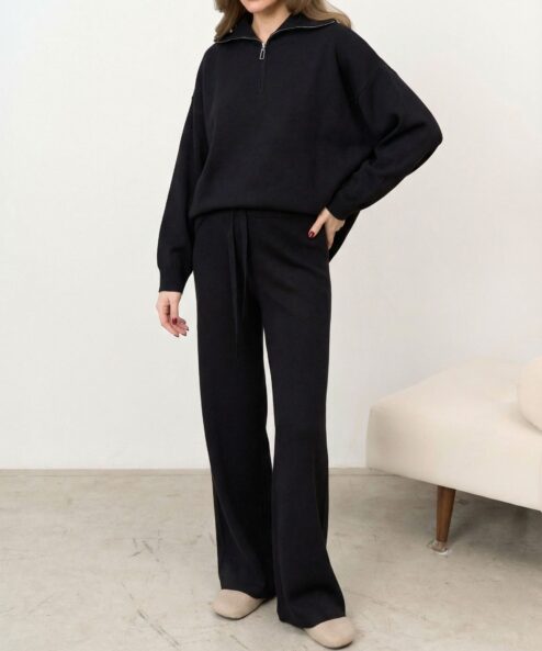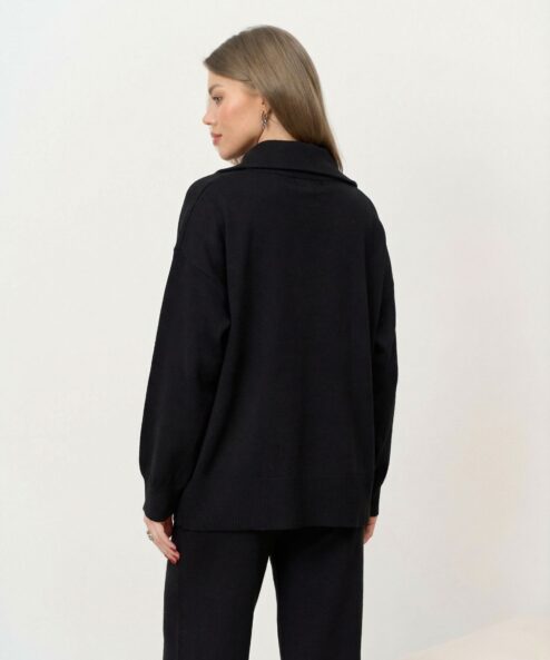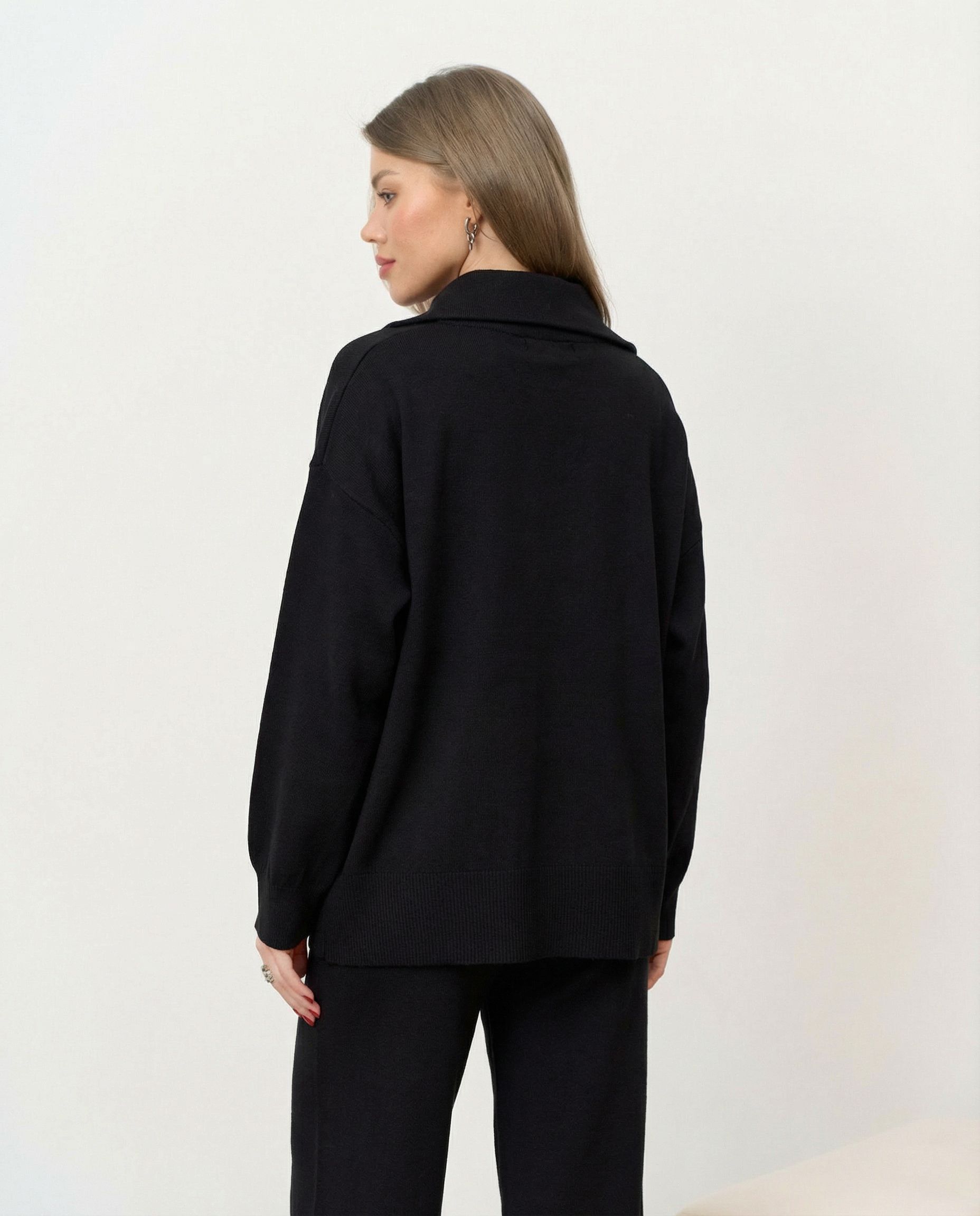 Стильный трикотажный комплект из трикотажа, состоящий из брюк прямого кроя и удлиненного джемпера с молнией. Модный фасон стройнит и визуально вытягивает фигуру. Подойдет на период беременности и после.