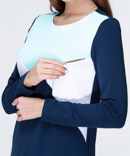 Трендовое платье для беременных и кормящих из трикотажа в стиле color-block.