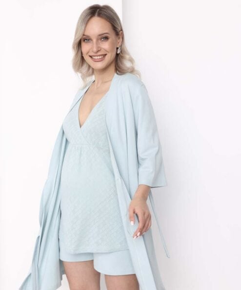 Костюм состоит из мягких шорт, топа и халата, выполненных из качественного мягкого хлопка. Это удобная и практичная домашняя одежда для беременных и кормящих мам. Благодаря свободному крою костюм не сковывает движения, его можно носить на любом сроке беременности и после. Есть секрет для кормления, который позволяет кормить малыша. Такой костюм станет отличной одеждой для сна и отдыха.